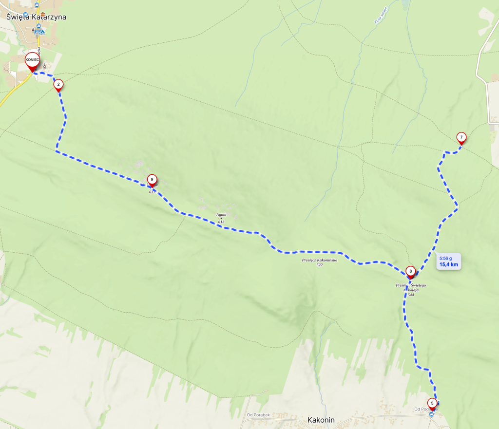 Trasa ze Świętej Katarzyny na Łysicę, przez Przełęcz Świętego Mikołaja aż do Kakonina liczy około 12 km.