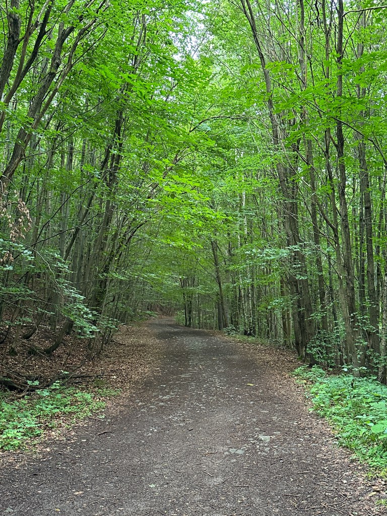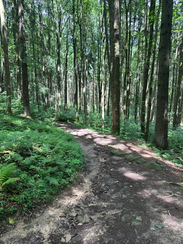 Potem szliśmy żółtym szlakiem — łatwiejszym i przyjaznym dla kolan. Później, już niebieskim szlakiem, dotarliśmy do parkingu. Ten ostatni odcinek był wyjątkowo przyjemny: zalesiony, cichy i praktycznie bezludny, choć miejscami całkiem stromy.