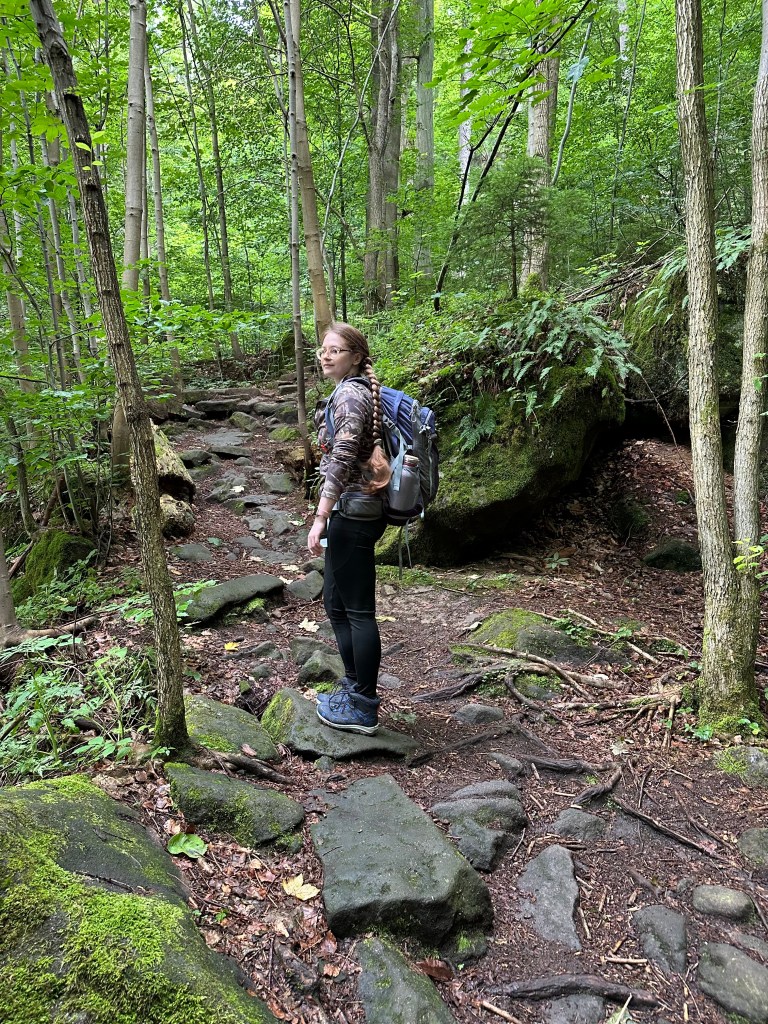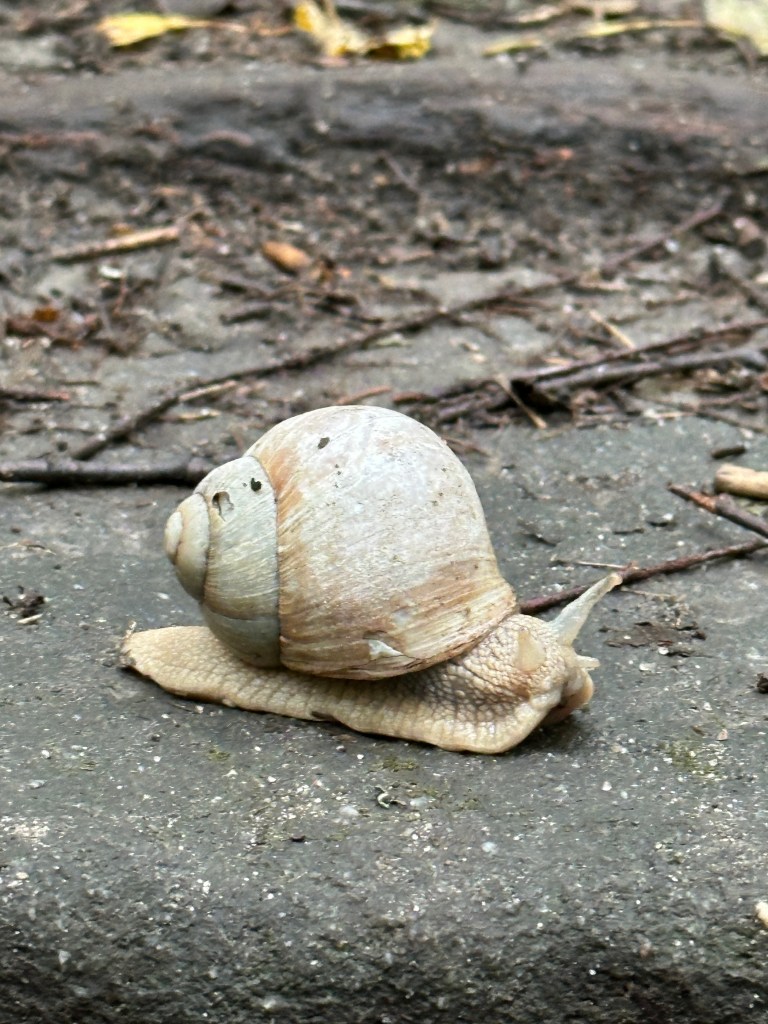 Dalej, już żółtym szlakiem, zaczęliśmy wspinaczkę przez las. Ścieżka była wąska, kamienista i kręta, a co chwilę mijaliśmy ciekawe formacje skalne i ruiny starych zabudowań — ślady dawnego życia, które rozbudzały naszą wyobraźnię. Co ciekawe, przez długi czas szliśmy zupełnie sami — ani śladu innych turystów. Za to spotkaliśmy ślimaka!