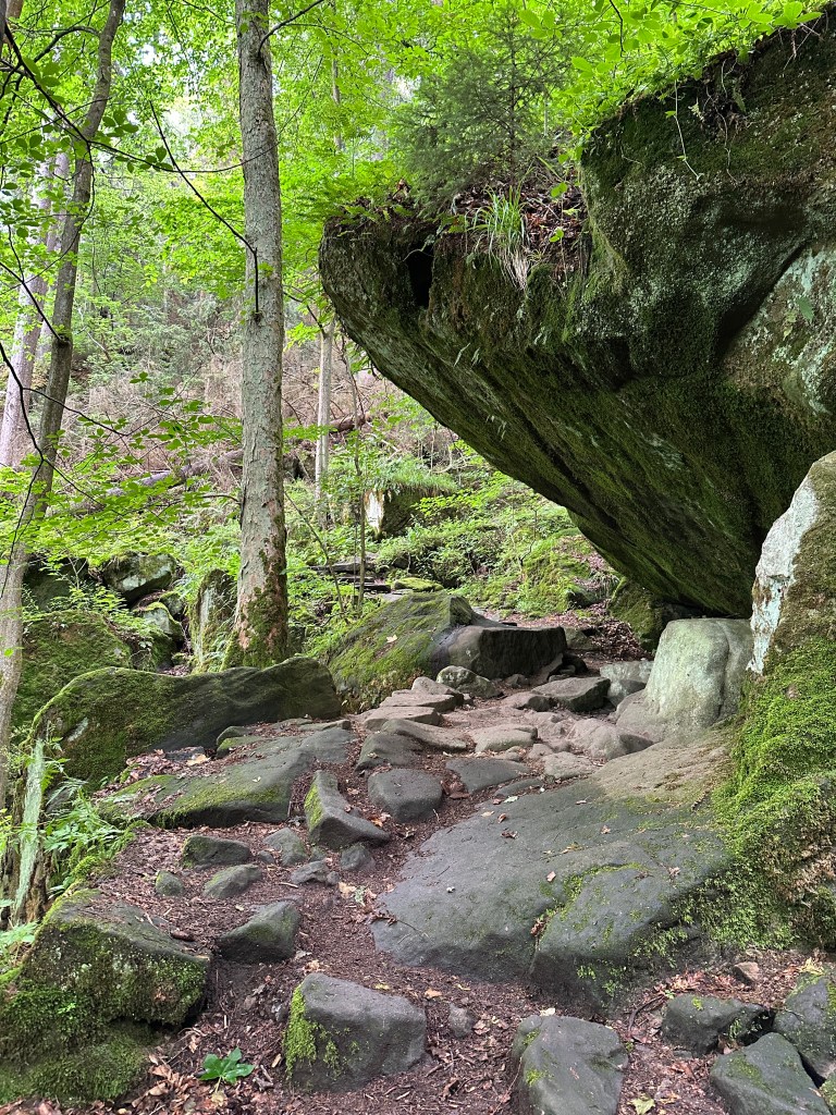 Końcowe podejście niebieskim szlakiem na sam Szczeliniec to już typowe górskie wyzwanie: stromo, nierówno i intensywnie. Wymagało to dobrej formy, a przy zmęczeniu z wcześniejszej części dnia — dodatkowego skupienia.