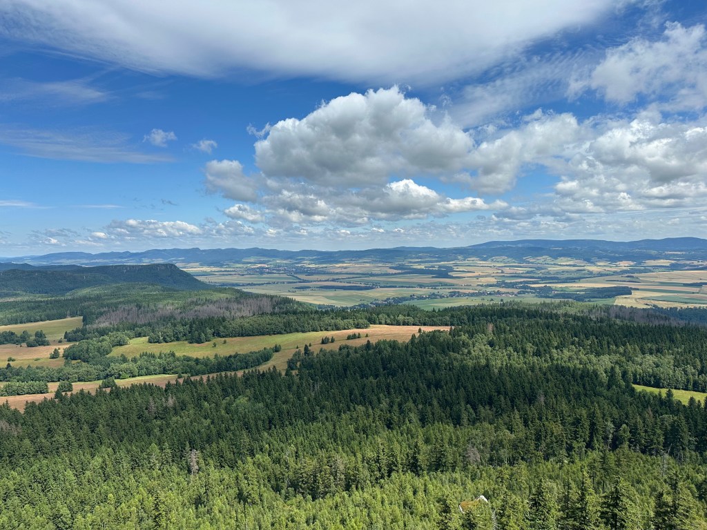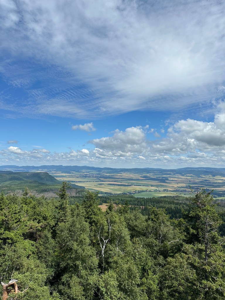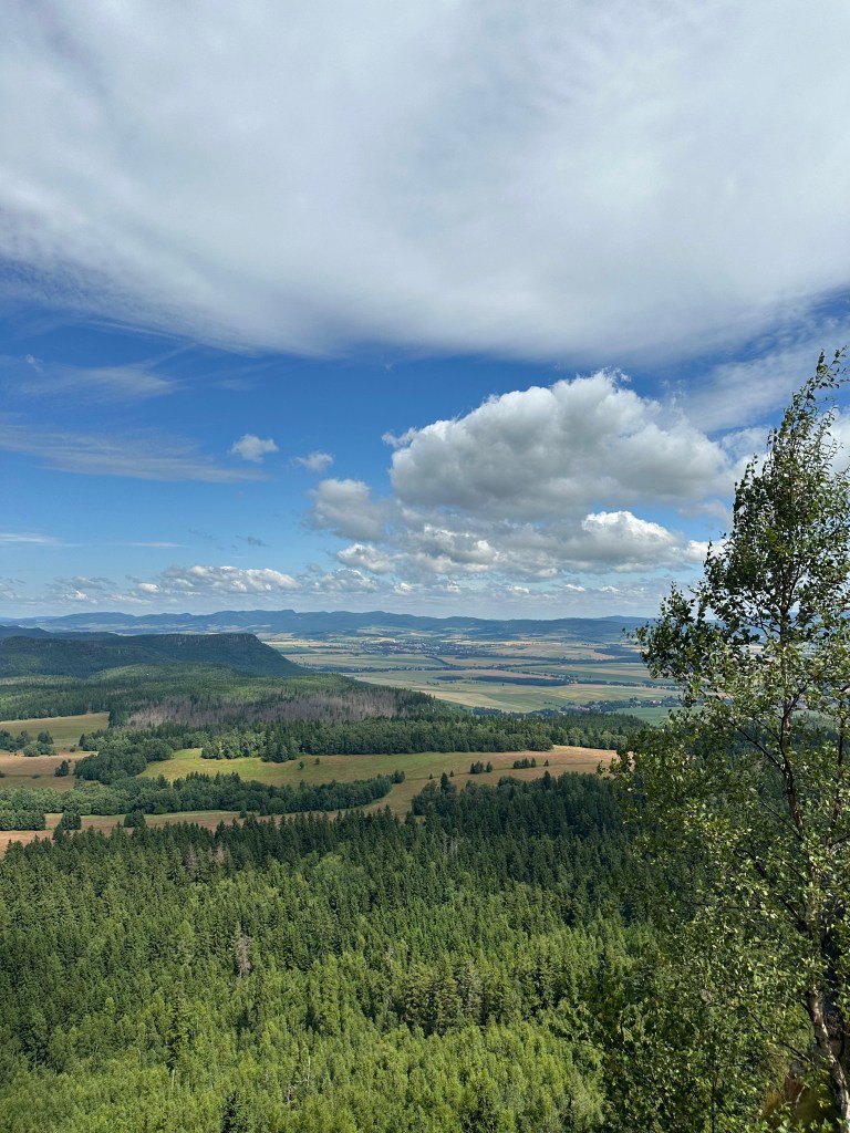Przeszliśmy widokową ścieżką przez labirynt Szczelińca, podziwiając kilkanaście charakterystycznych formacji skalnych. Słońce pięknie oświetlało krajobraz łąk i pól poniżej, a widoczność była doskonała.
