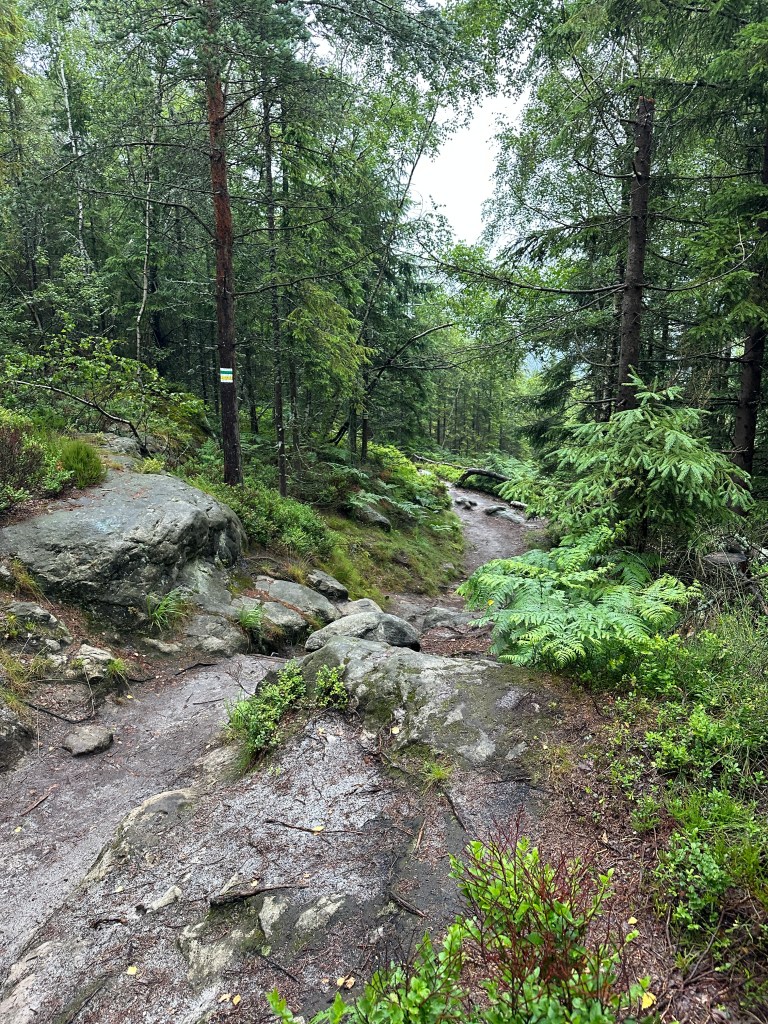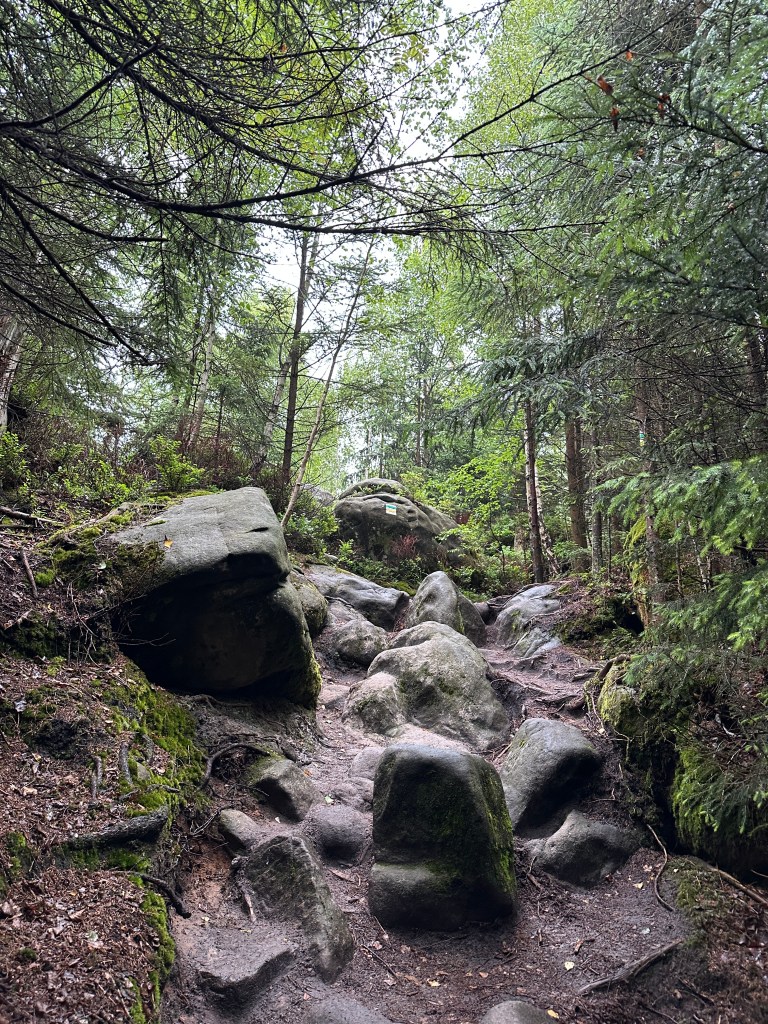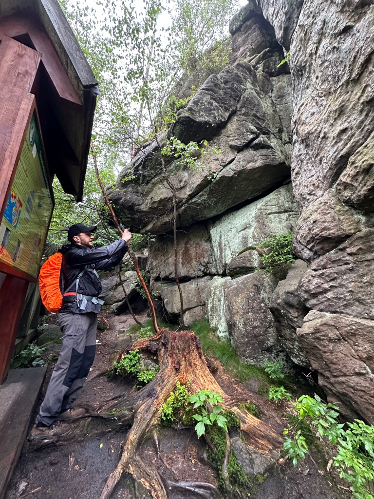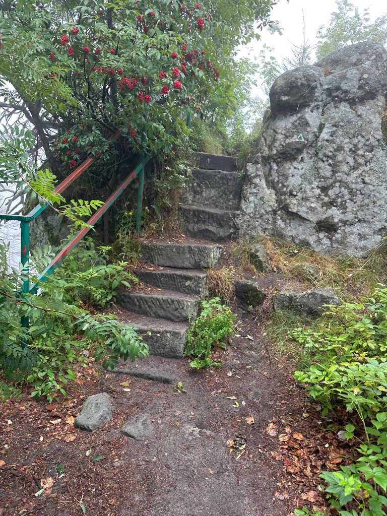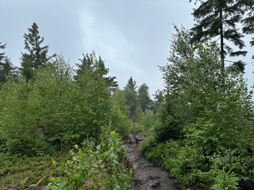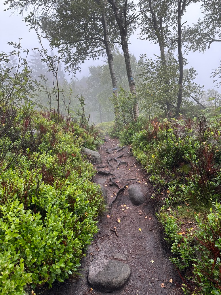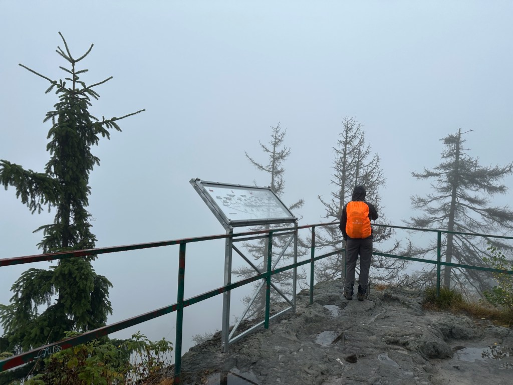 Podejście na taras widokowy było krótkie, choć trudne: mokre kamienie, śliskie korzenie, silny wiatr i zacinający deszcz wymagały od nas maksymalnego skupienia. Prawie udało nam się zgubić drogę przez mylące oznaczenia.