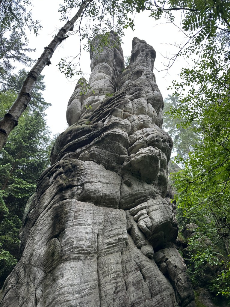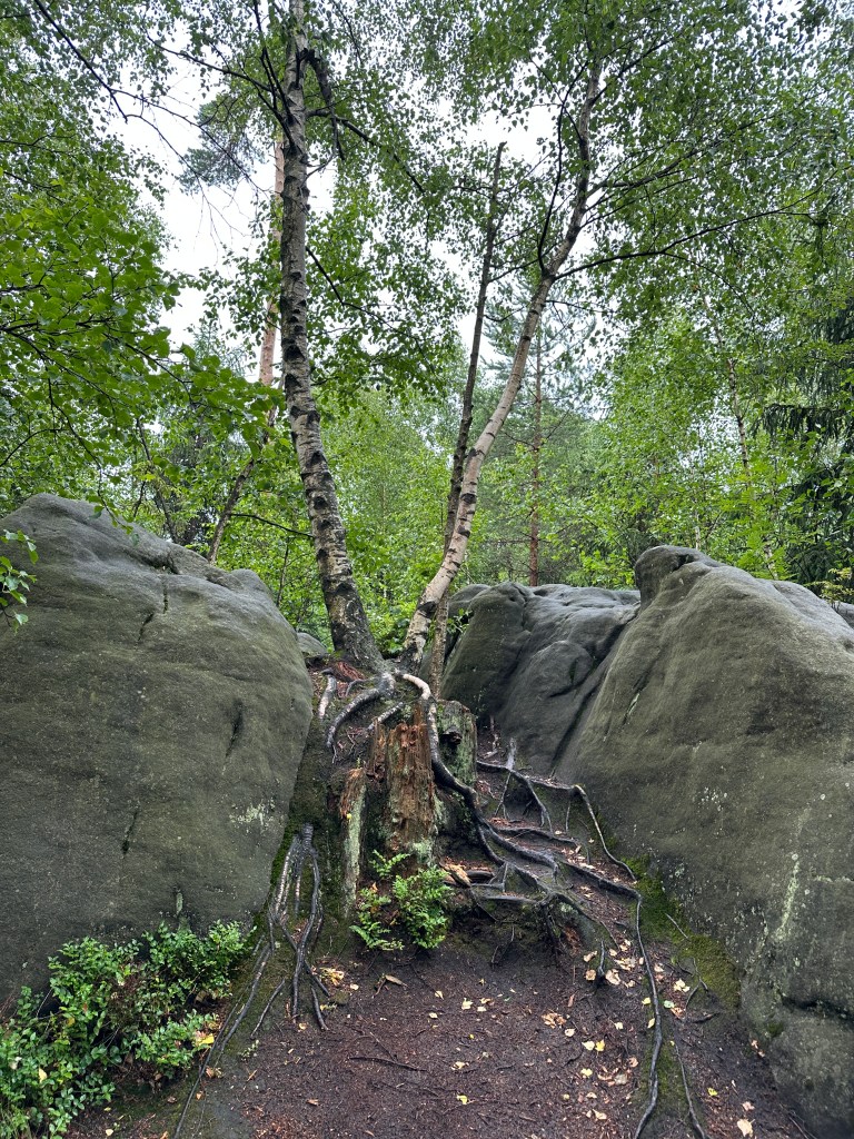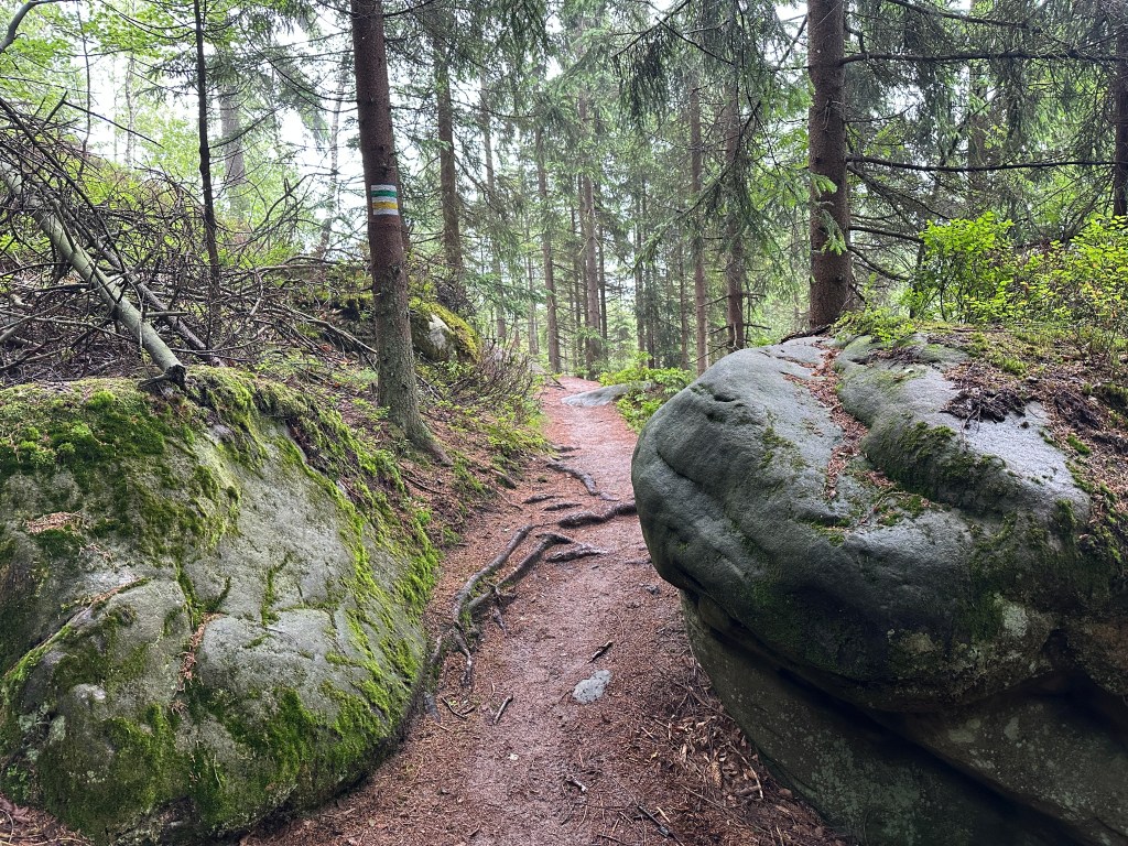 Ścieżka wiodła nas przez zakręty leśnych dróg, wśród licznych formacji skalnych, młodych brzózek i wilgotnych paproci.