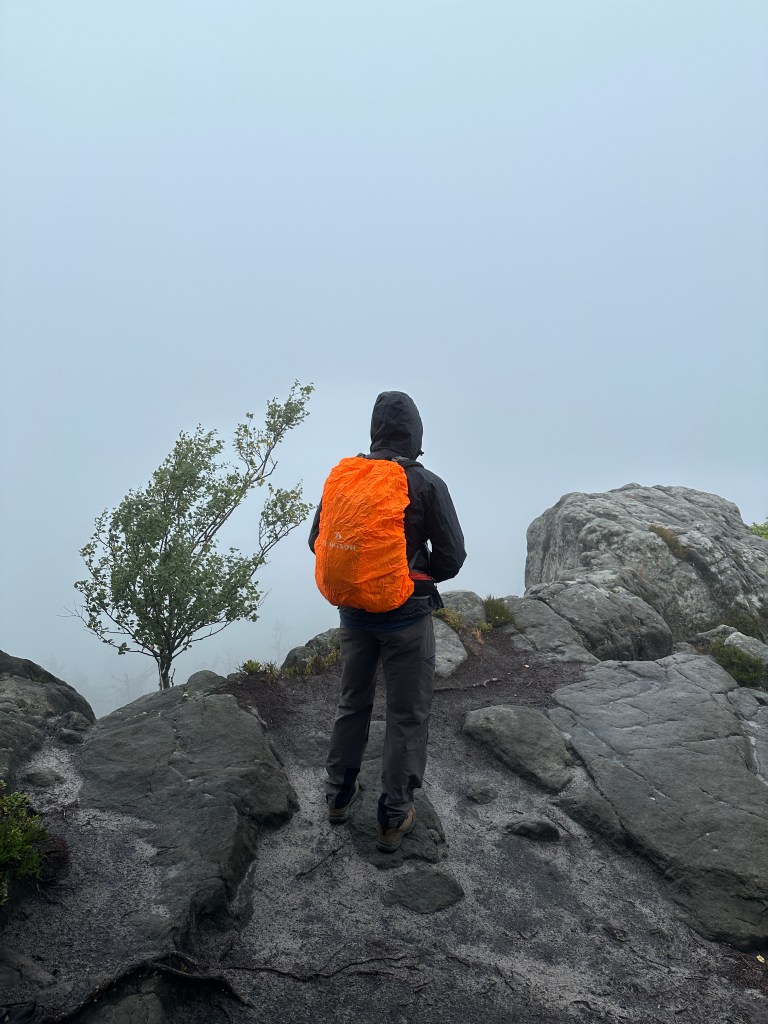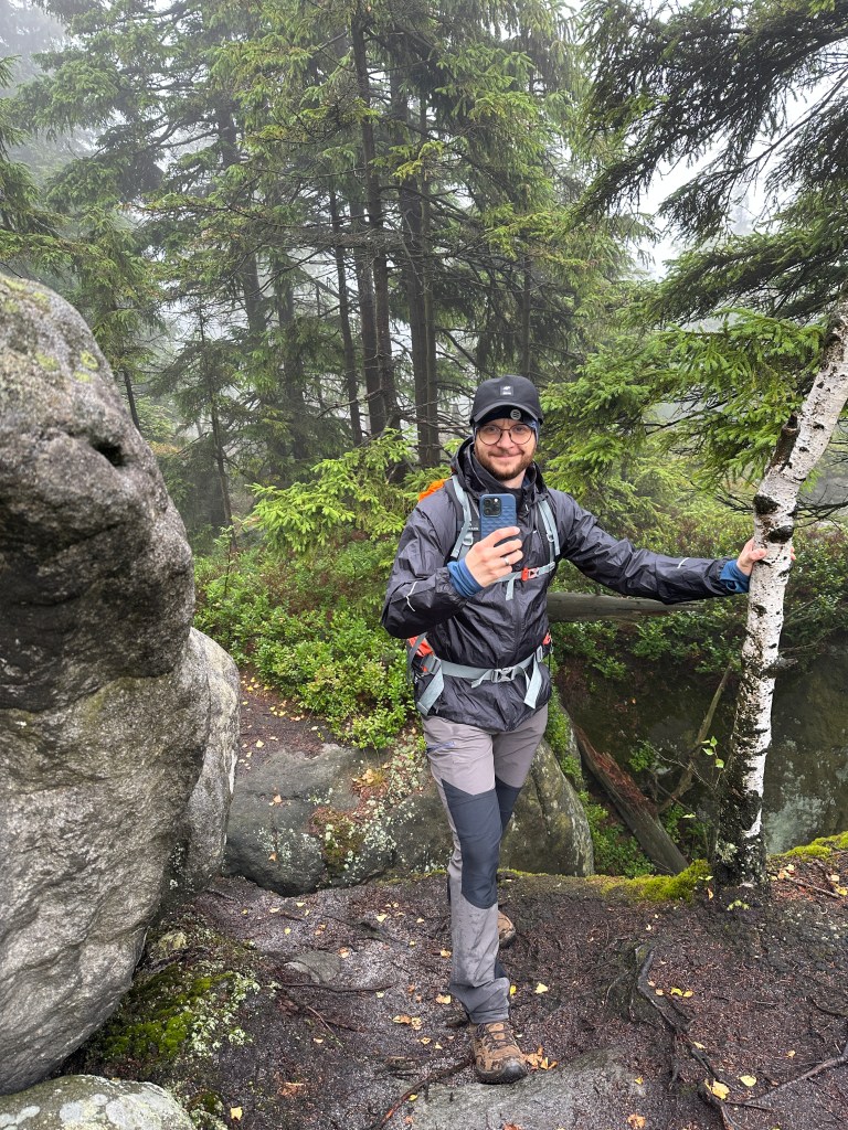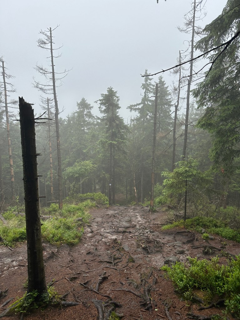 Zaczęliśmy od wejścia na Narożnik. Już od pierwszych kroków poczuliśmy charakter tej trasy — ostre podejście, mokry las spowity chmurami i wszechobecny wiatr, który zagłuszał własne myśli. Buty ślizgały się po mokrych korzeniach. Wyglądało to bardzo zachęcająco.