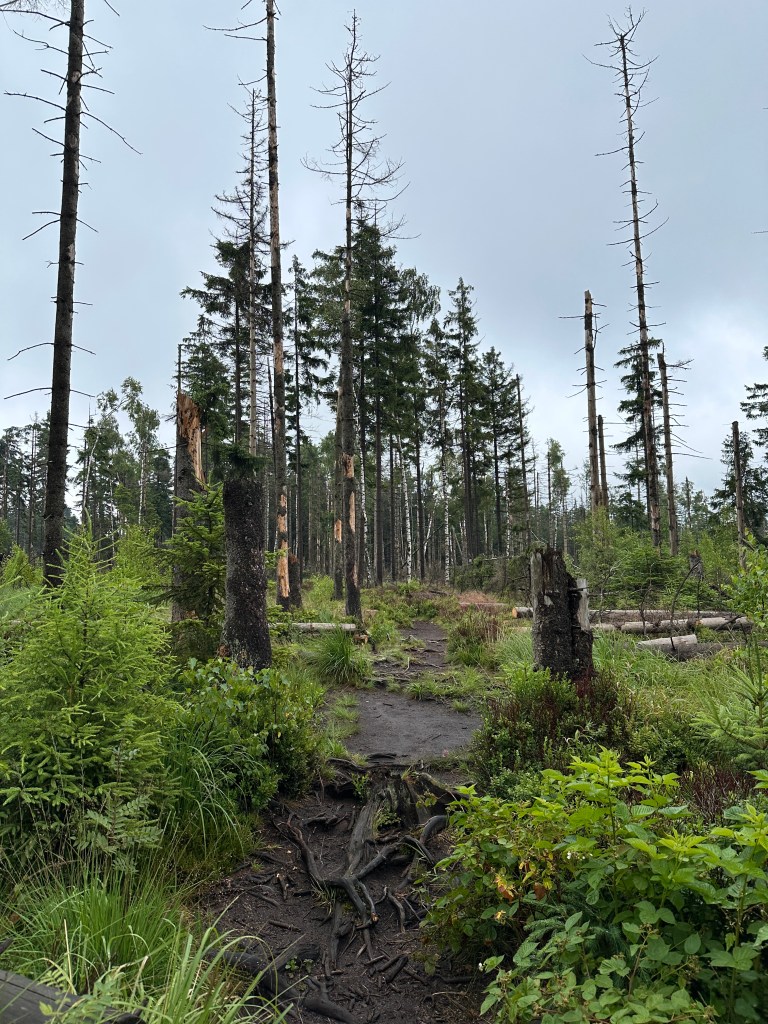 Niestety znowu wkroczyliśmy w kawałek martwego lasu, liczne powalone drzewa i kłody na trasie nie ułatwiały przejścia. Jedno kolano lekko ucierpiało.