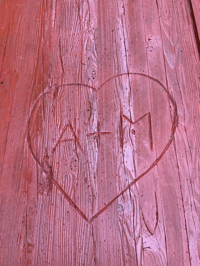 Skręciliśmy w zielony szlak i natrafiliśmy na drewnianą kładkę, której brązowy kolor kontrastował z soczystą zielenią młodego lasu. Las był gęsty a kładka mokra od mżawki. Czekała tam na nas mała wzruszająca niespodzianka: inicjały wyryte w sercu, akurat nasze… I nie, nie popieramy aktów wandalizmu zakochanych 😉