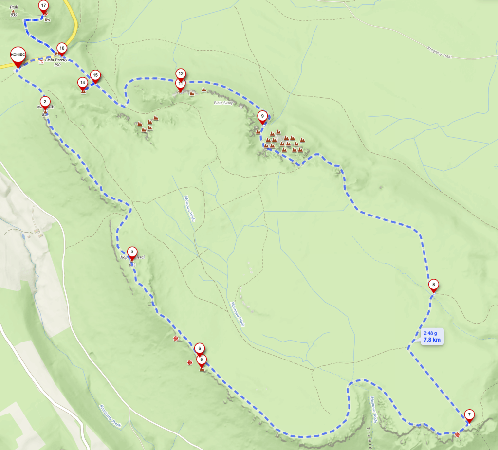 Trasa: Parking na Lisiej Przełęczy – Niebieski Szlak – Narożnik (jedyne większe podejście na tej trasie) – Skała Czaszki – Skały Puchacza – Na skrzyżowaniu szlaków skręcamy w lewo w szlak zielony – Białe Skały – ścieżka na „Podmorskie kanały” – ścieżka na Wiszącą skałę – Parking Białe Skały – Fort Karola – Powrót na parking na Lisiej Przełęczy