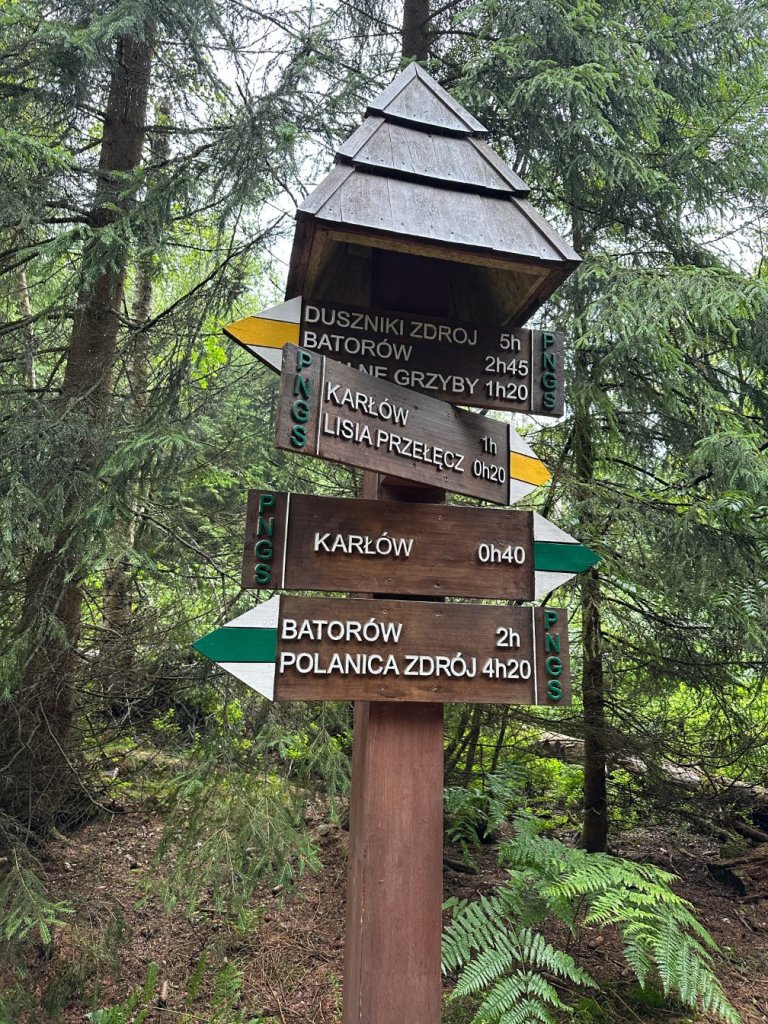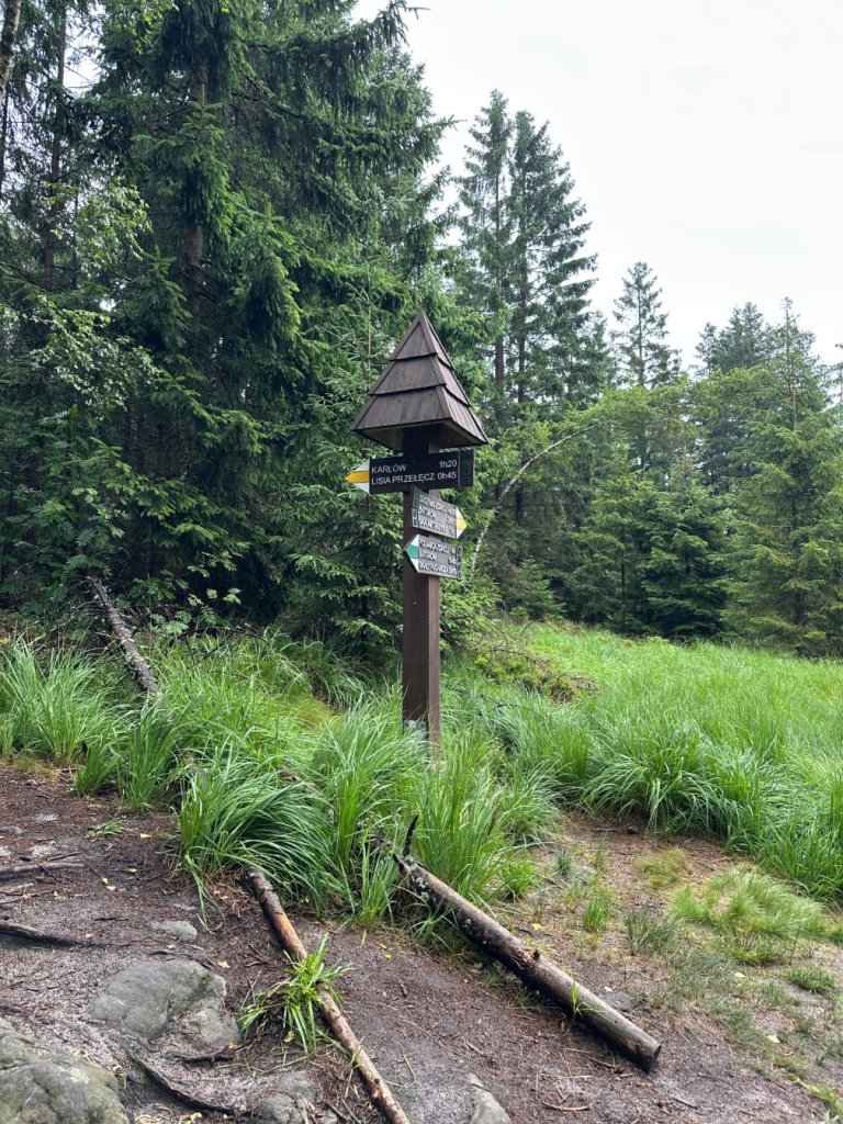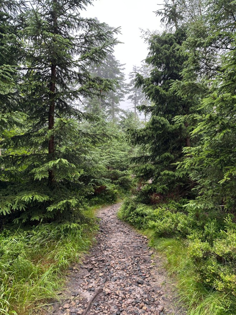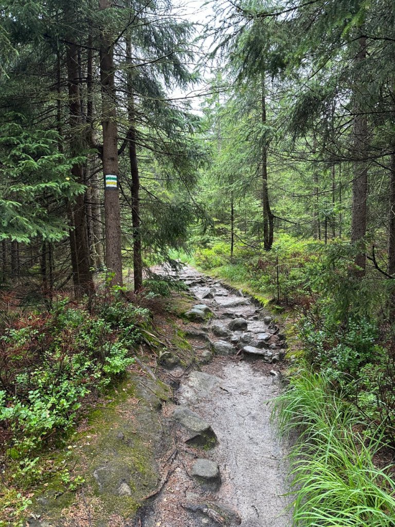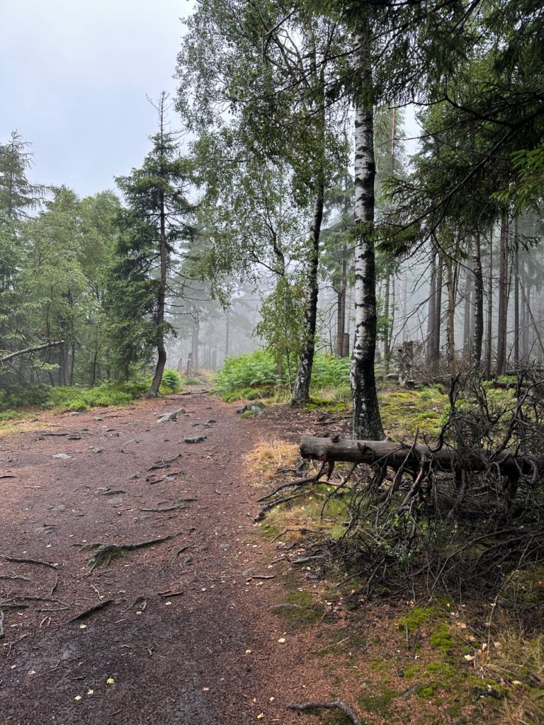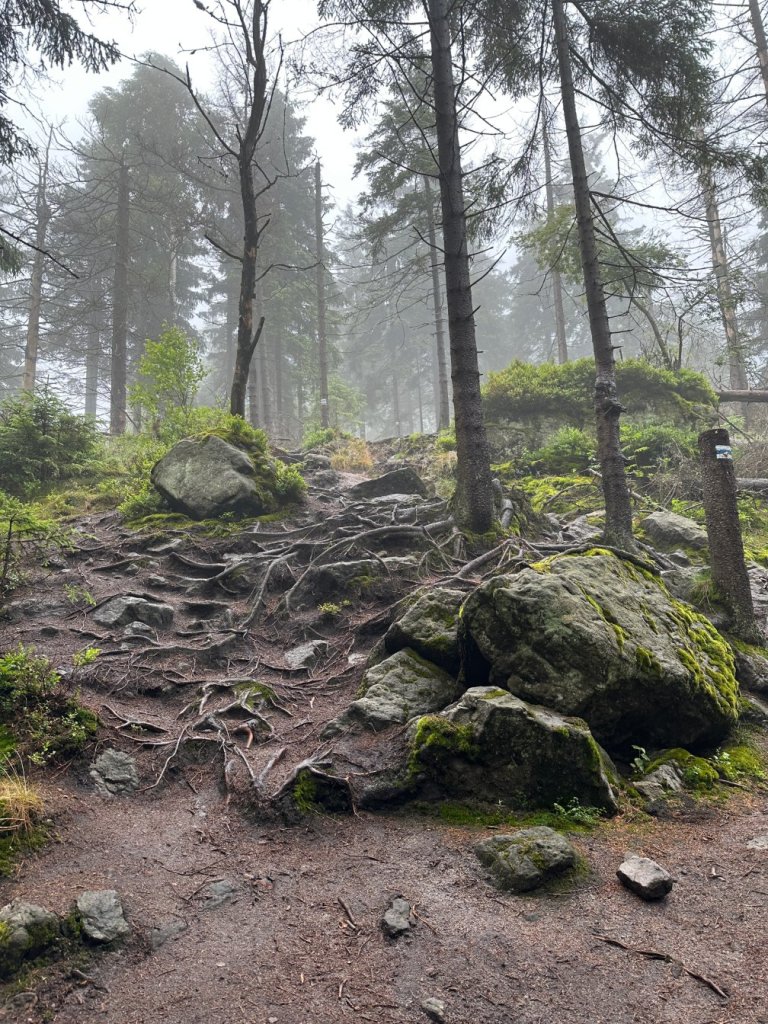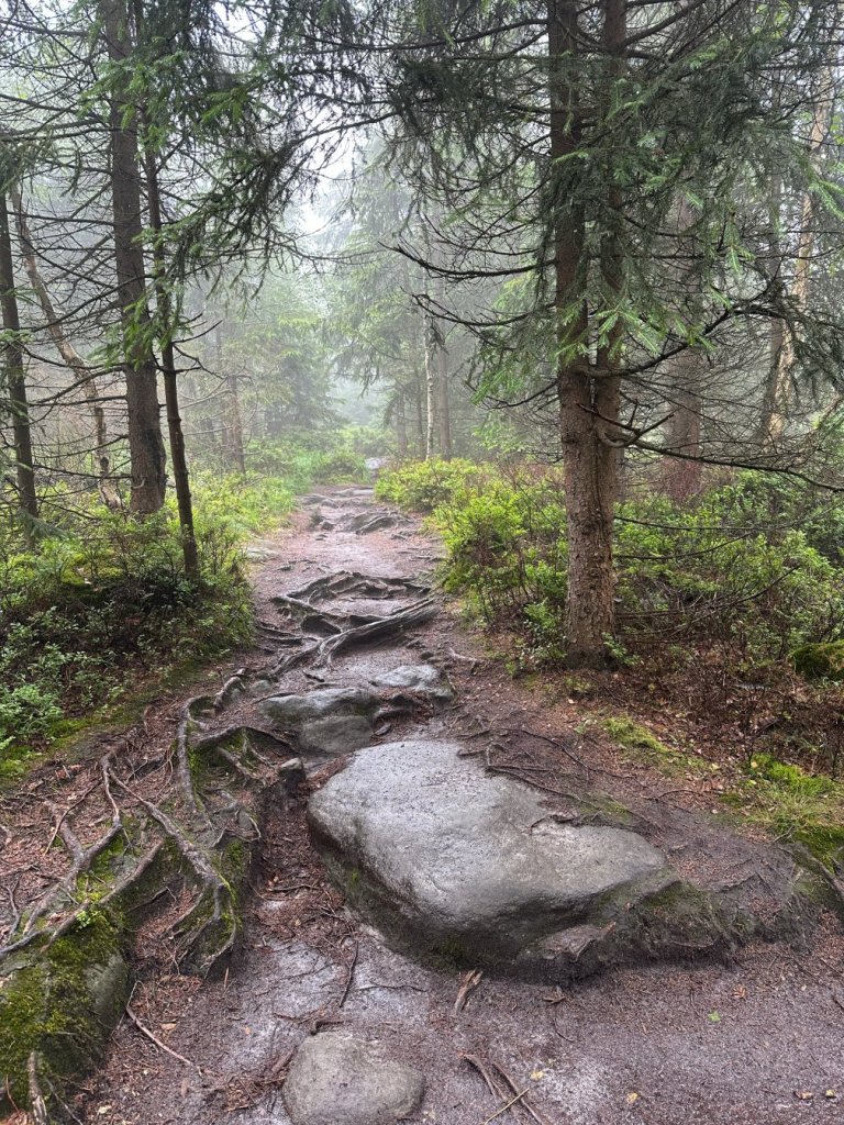 Zaczęliśmy od wejścia na Narożnik. Już od pierwszych kroków poczuliśmy charakter tej trasy — ostre podejście, mokry las spowity chmurami i wszechobecny wiatr, który zagłuszał własne myśli. Buty ślizgały się po mokrych korzeniach. Wyglądało to bardzo zachęcająco.