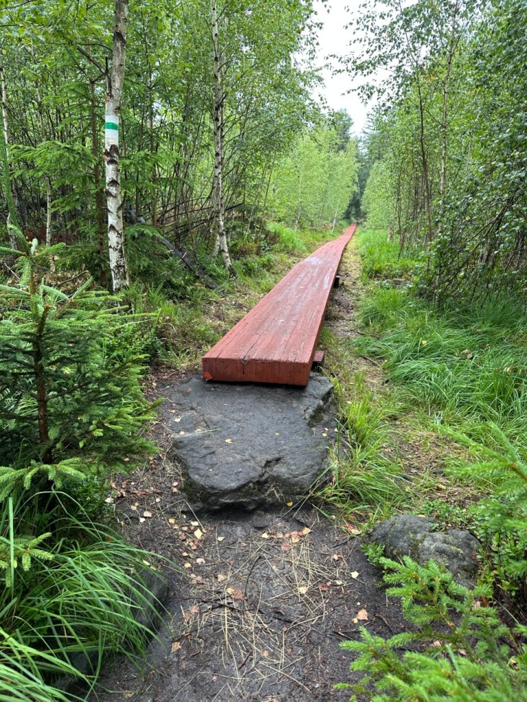 Skręciliśmy w zielony szlak i natrafiliśmy na drewnianą kładkę, której brązowy kolor kontrastował z soczystą zielenią młodego lasu. Las był gęsty a kładka mokra od mżawki. Czekała tam na nas mała wzruszająca niespodzianka: inicjały wyryte w sercu, akurat nasze… I nie, nie popieramy aktów wandalizmu zakochanych 😉