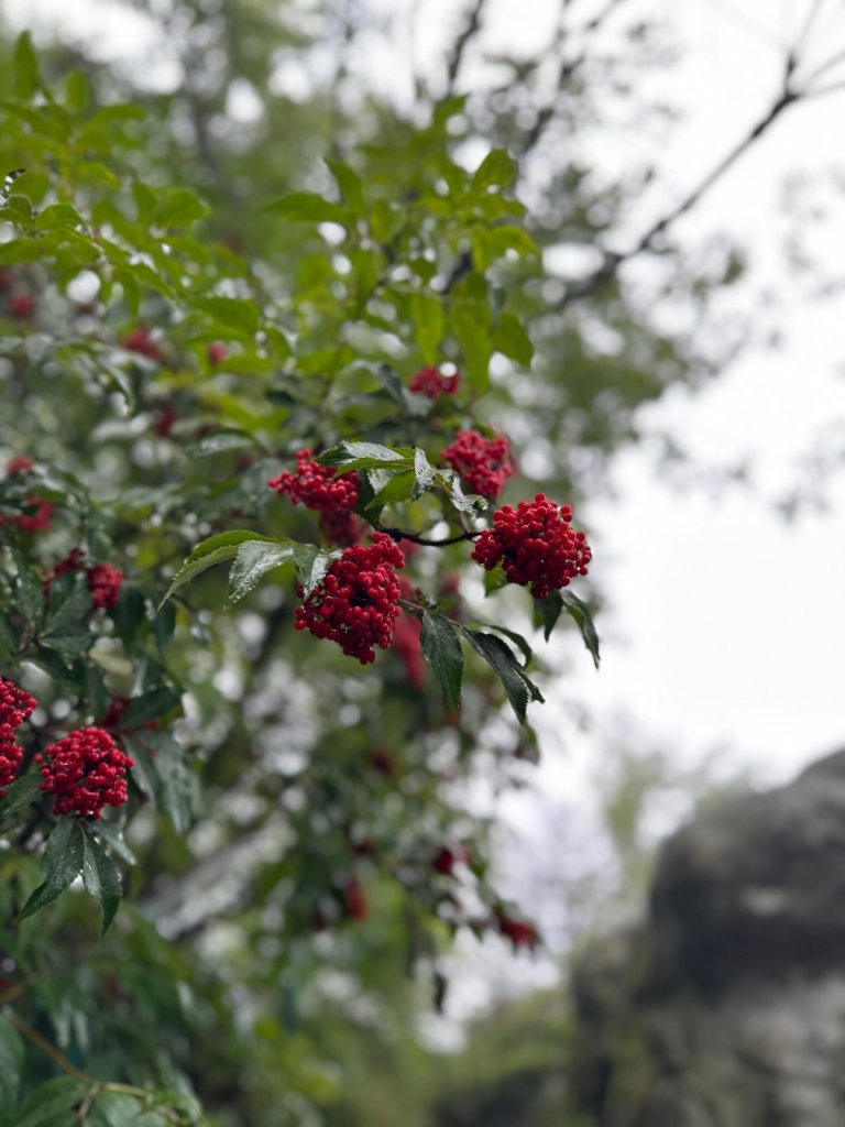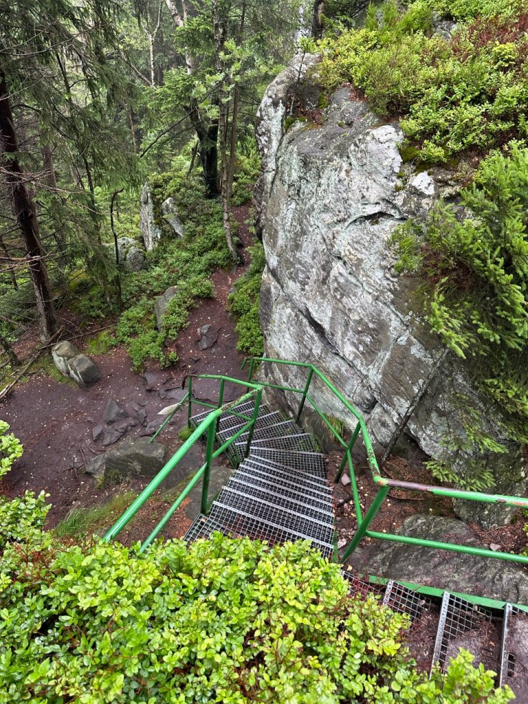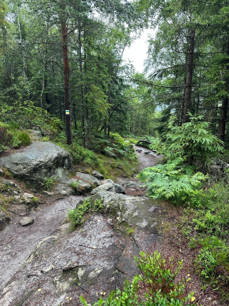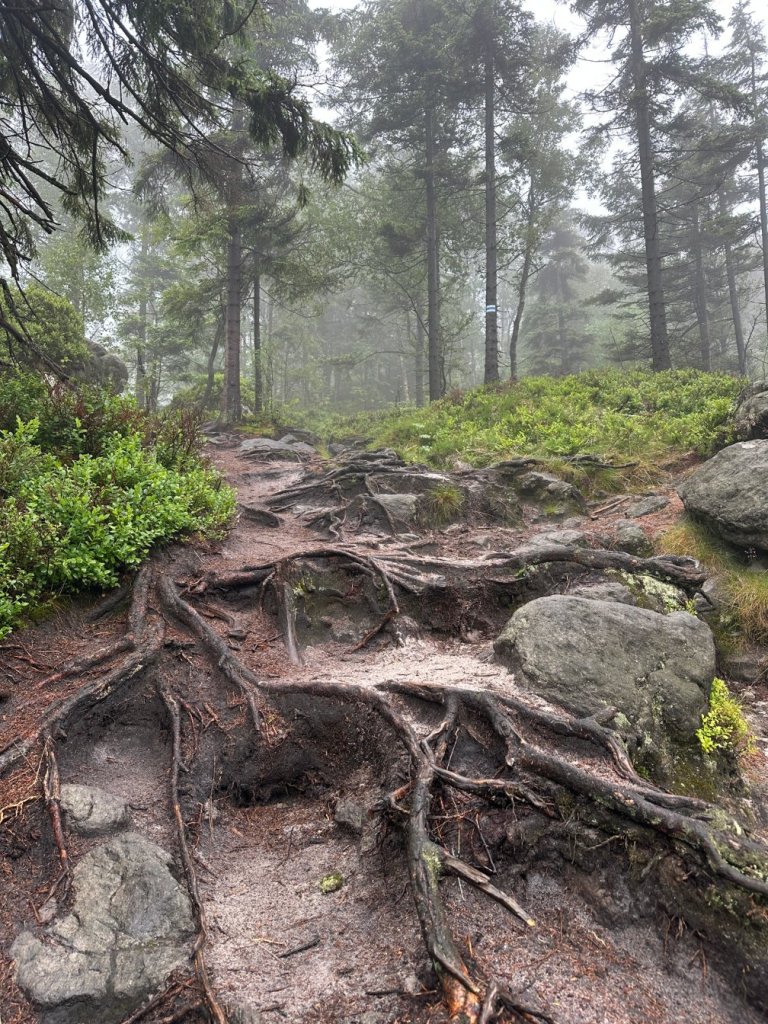 Podejście na taras widokowy było krótkie, choć trudne: mokre kamienie, śliskie korzenie, silny wiatr i zacinający deszcz wymagały od nas maksymalnego skupienia. Prawie udało nam się zgubić drogę przez mylące oznaczenia.