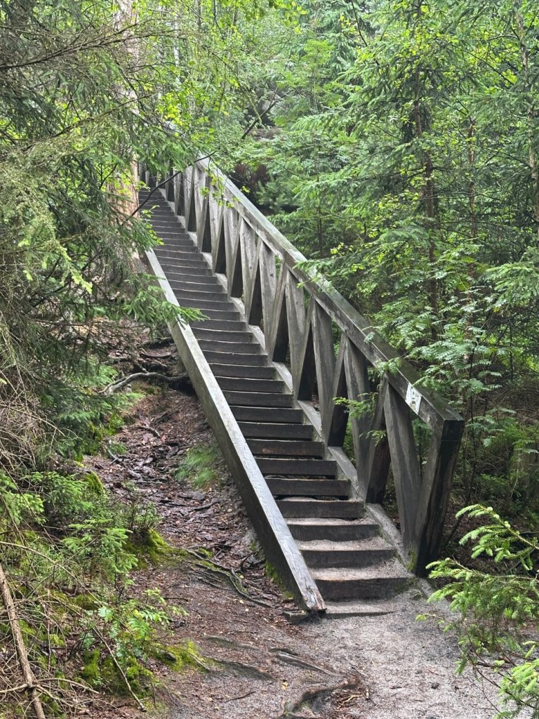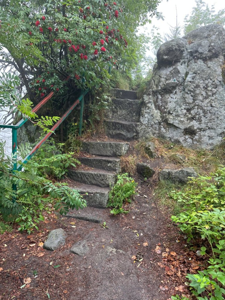 Choć trasa nie była długa — niecałe 10 km — warunki pogodowe i wymagający teren zamieniły ten spacer w pełnoprawne wyzwanie. Śliskie kładki, kamienie, korzenie i schody oraz wiatr i deszcz testowały zarówno kondycję, jak i ostrożność. Mimo to, dla nas to była przyjemna, choć wymagająca przygoda — nie chodziło o pokonanie trudności, ale o bycie w tej przestrzeni, chłonięcie jej klimatu i detali. Podczas słonecznej i suchej pogody trasa ta jest dużo łatwiejszym spacerem, ale nadal tam niesamowicie wieje.