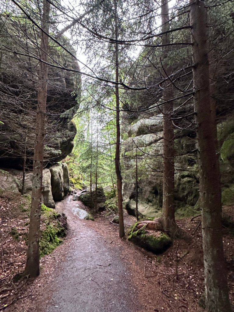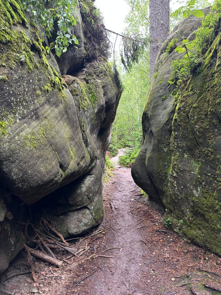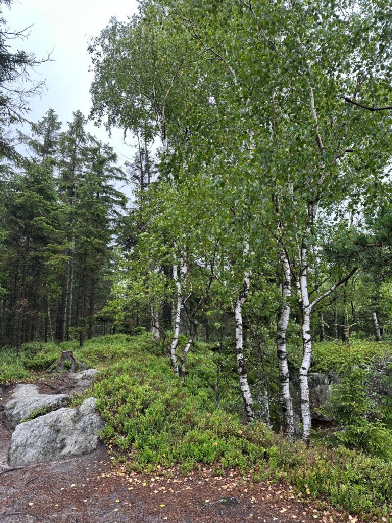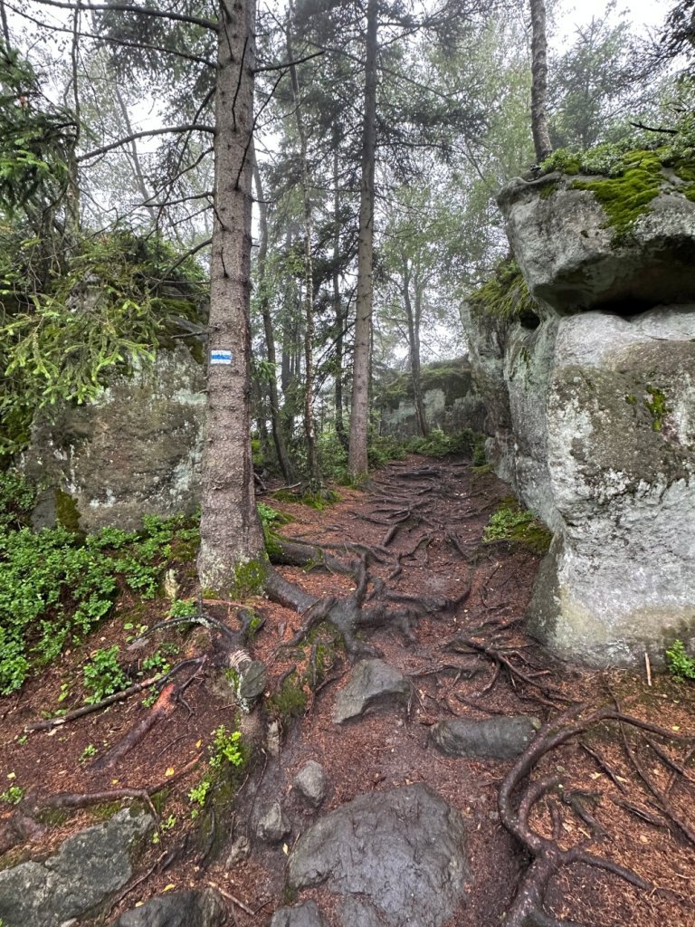 Ścieżka wiodła nas przez zakręty leśnych dróg, wśród licznych formacji skalnych, młodych brzózek i wilgotnych paproci.