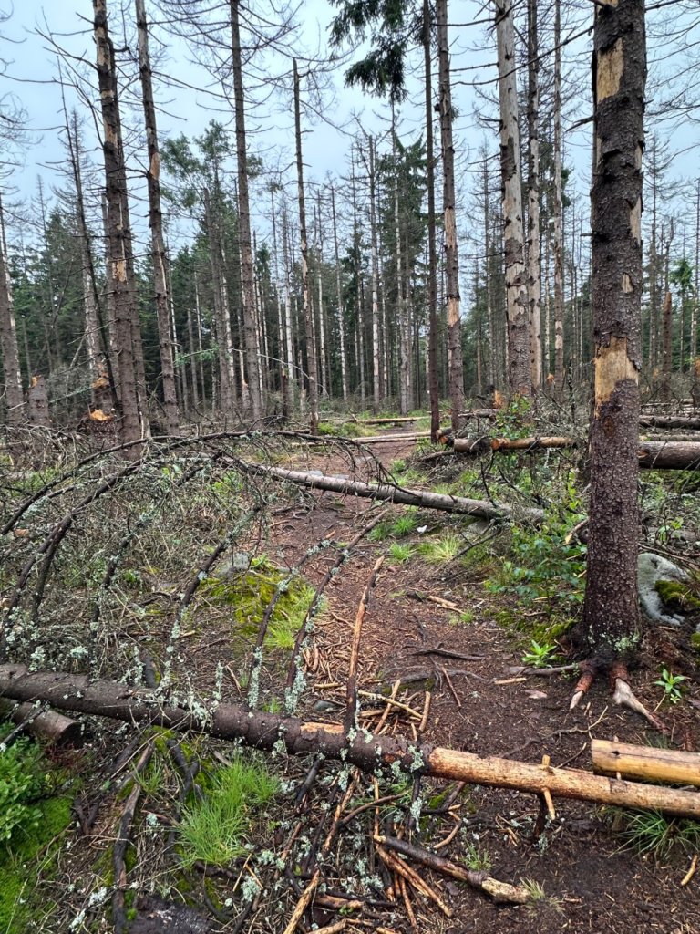 Niestety znowu wkroczyliśmy w kawałek martwego lasu, liczne powalone drzewa i kłody na trasie nie ułatwiały przejścia. Jedno kolano lekko ucierpiało.