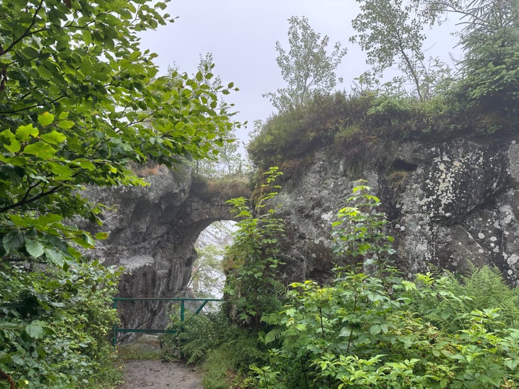 Kolejną geoatrakcją była Wisząca Skała, ścieżka do niej jeszcze bardziej stroma, kręta, zarośnięta niż ta do podmorskich kanałow. Woda z drzew spadała nam na głowy.