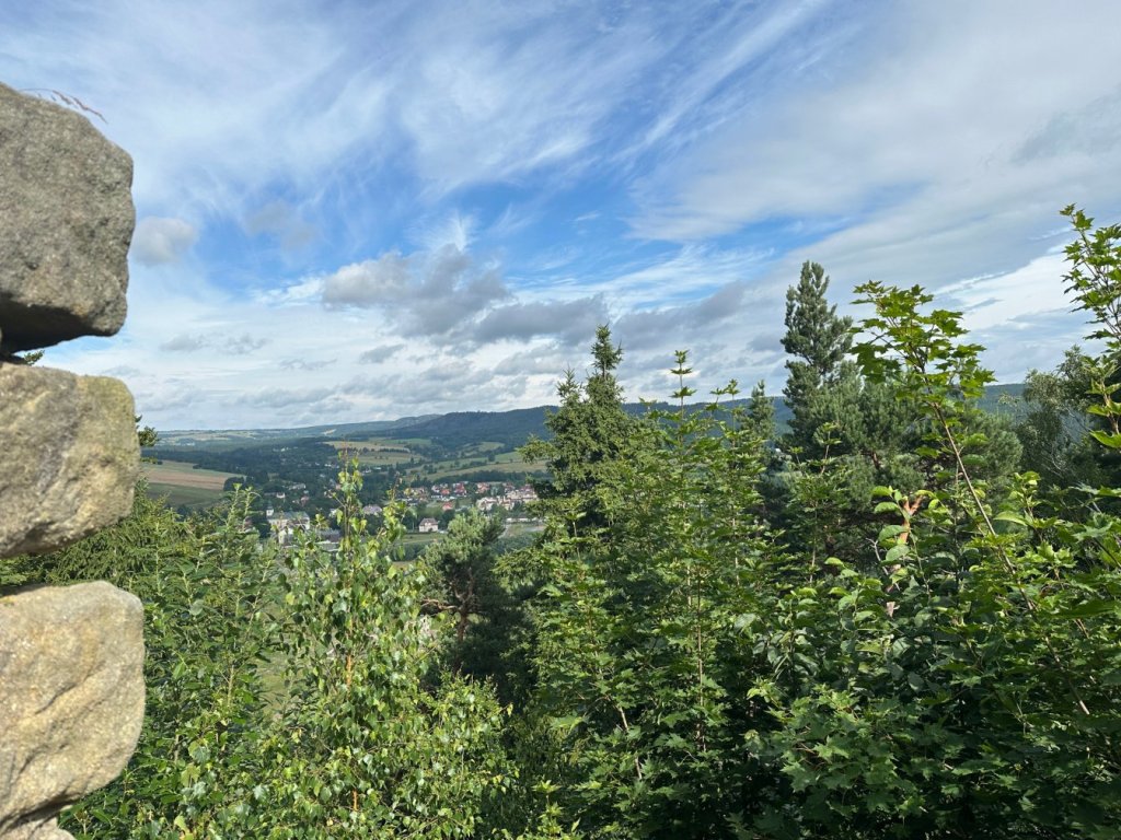 Dotarliśmy do lekko zarośniętego punktu widokowego, o poprzednim zupełnie zapomnieliśmy, więc chętnie skorzystaliśmy z okazji zobaczenia widoczków chociaż tutaj. Ścieżki w lesie powoli zaczęły się zaludniać.