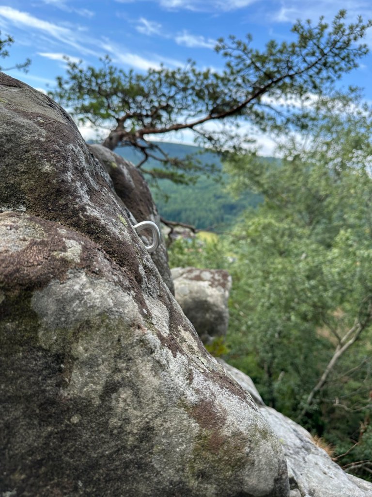 Wśród drzew zaczęły się pojawiać pierwsze skałki, a my mijaliśmy miejsca, gdzie na co dzień wspinają się miłośnicy pionowych wyzwań. Nam by brakowało odwagi.