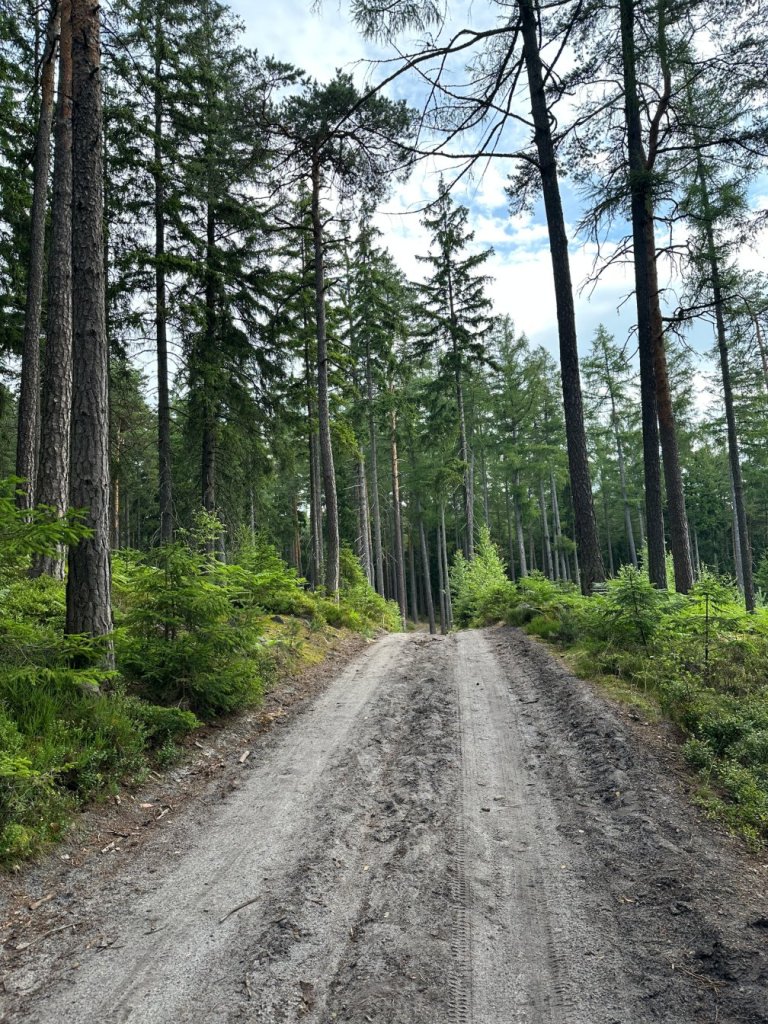 Nasza wyprawa rozpoczęła się spokojnie — od asfaltowego odcinka prowadzącego spod parkingu w stronę lasu.