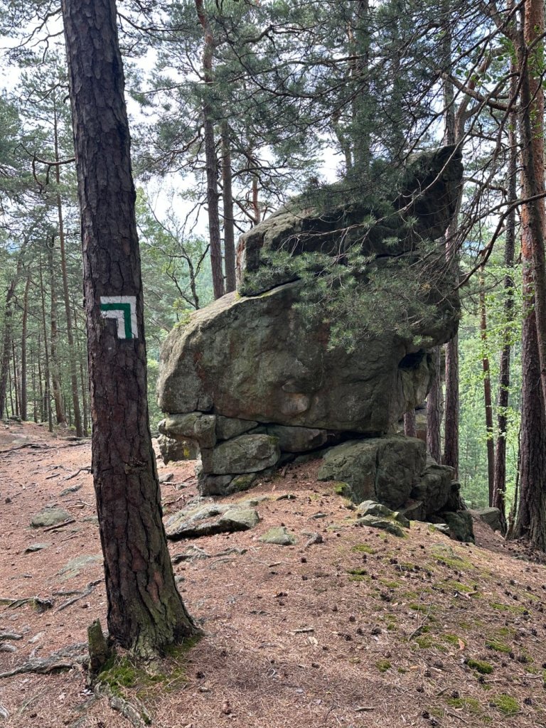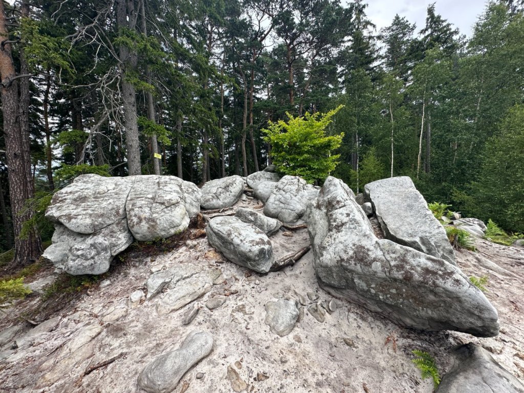 Nareszcie nasza ulubiona wiata! Można było zdjąć plecaki, napić się spokojnie wody i pomyśleć. Zdecydowaliśmy się na powrót żółtym szlakiem, który był łagodniejszy — przez las, znów mijając pojedyncze formacje skalne.