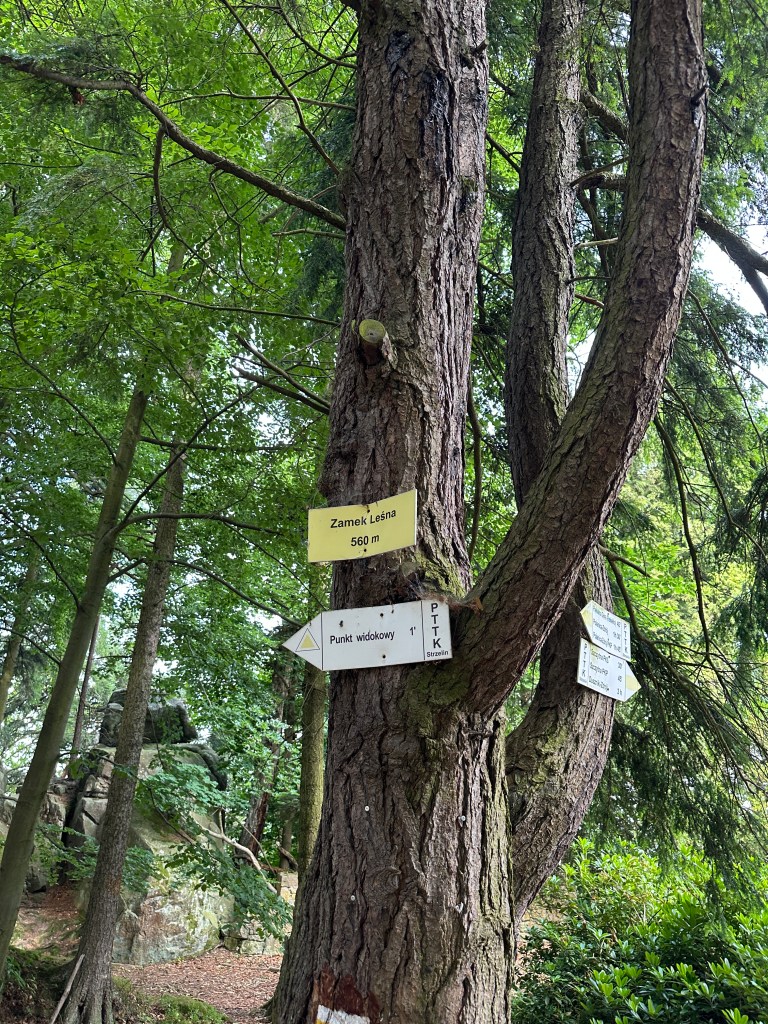 Za zamkiem, kierując się według mapki przy tablicy informacyjnej, wybraliśmy czarny szlak i ruszyliśmy w głąb lasu.