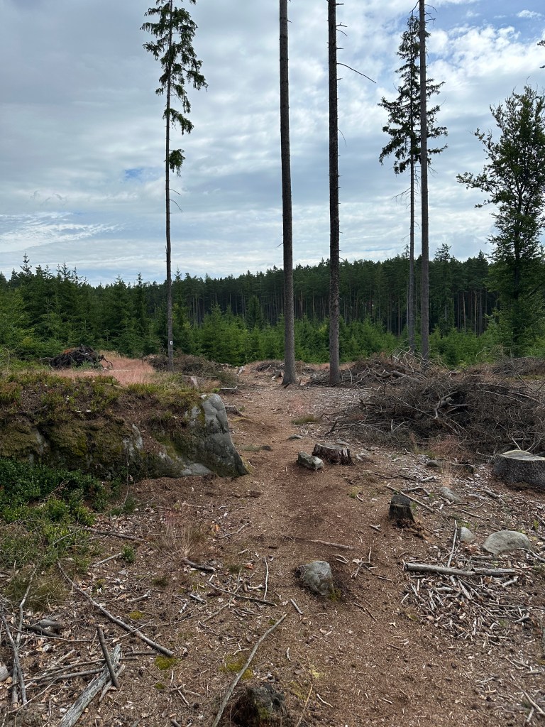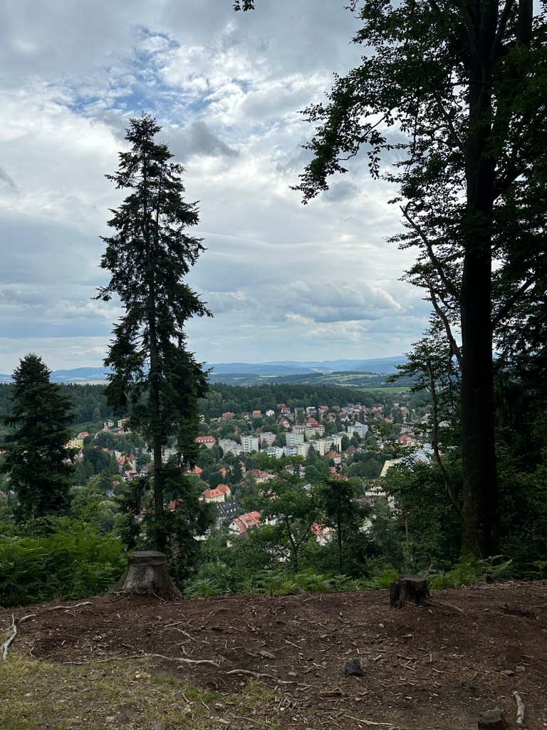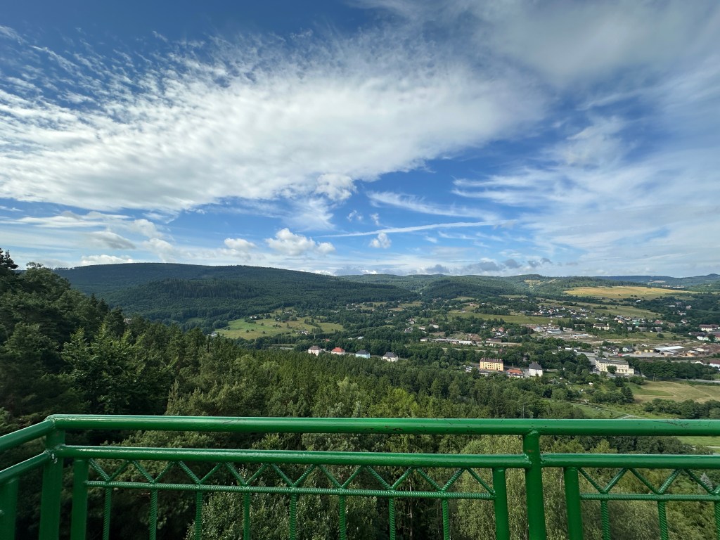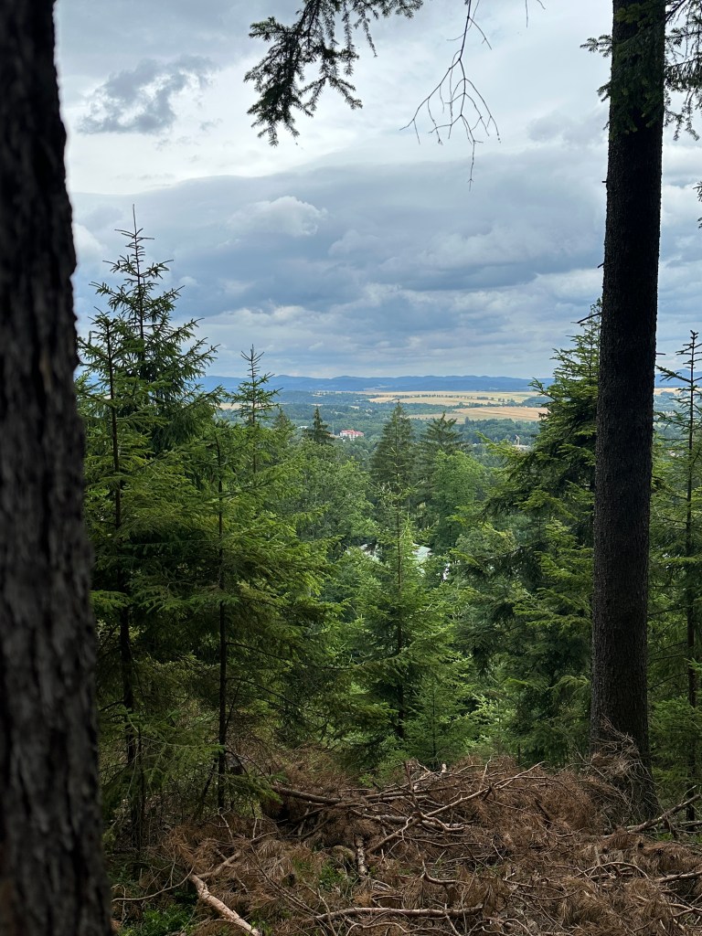 Dotarliśmy do lekko zarośniętego punktu widokowego, o poprzednim zupełnie zapomnieliśmy, więc chętnie skorzystaliśmy z okazji zobaczenia widoczków chociaż tutaj. Ścieżki w lesie powoli zaczęły się zaludniać.