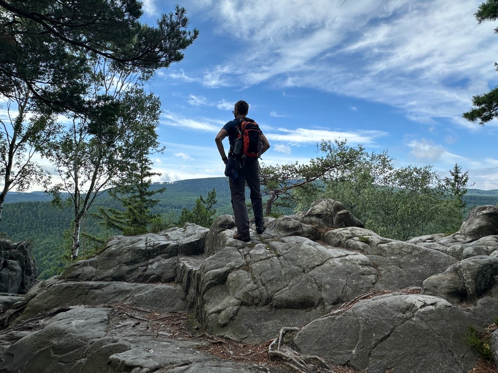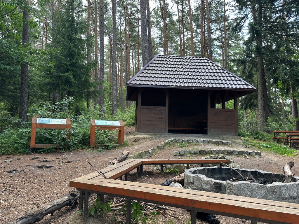 Nareszcie nasza ulubiona wiata! Można było zdjąć plecaki, napić się spokojnie wody i pomyśleć. Zdecydowaliśmy się na powrót żółtym szlakiem, który był łagodniejszy — przez las, znów mijając pojedyncze formacje skalne.