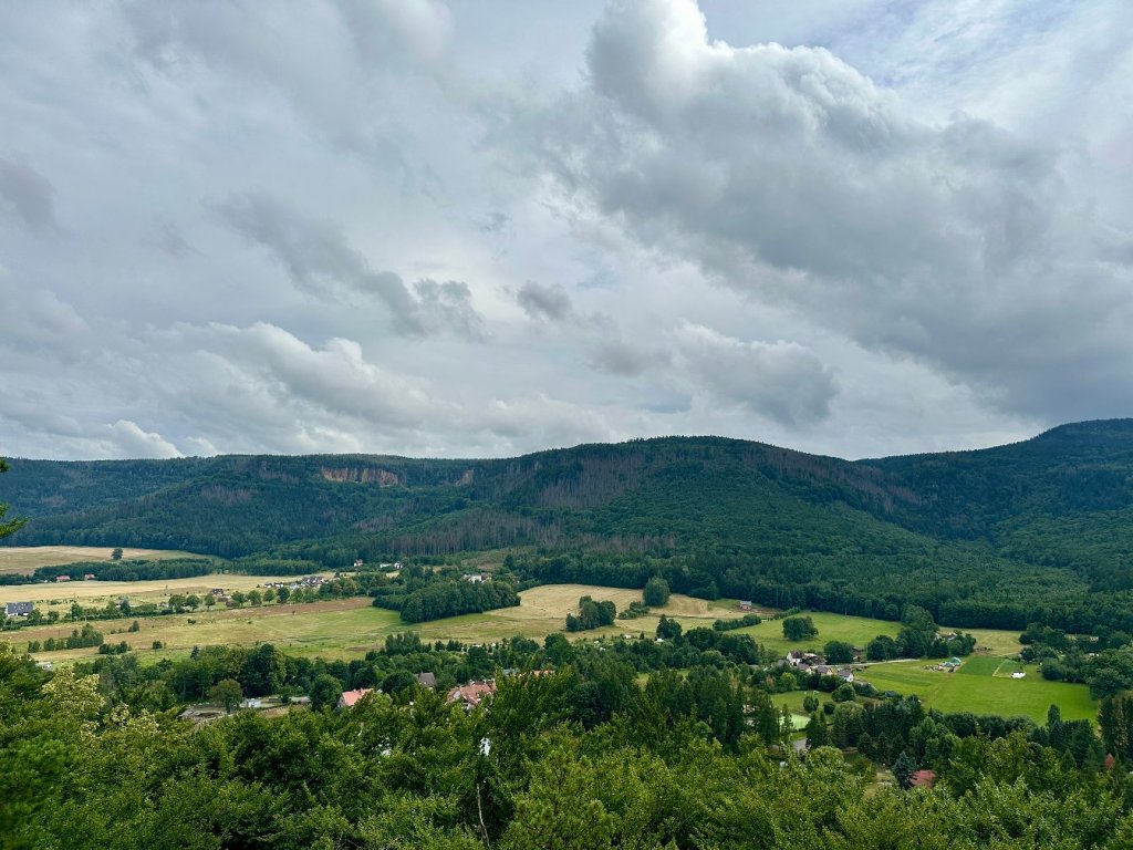 Dotarliśmy do wychodni skalnej gdzie zobaczyliśmy uroczy widok na dolinę pomimo pochmurnej pogody.