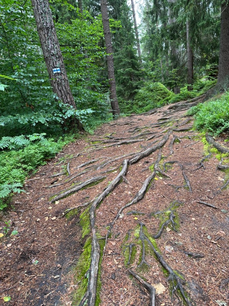 Podłoże było piaszczyste i widać było korzenie drzew, a wśród nich kolejne skałki.