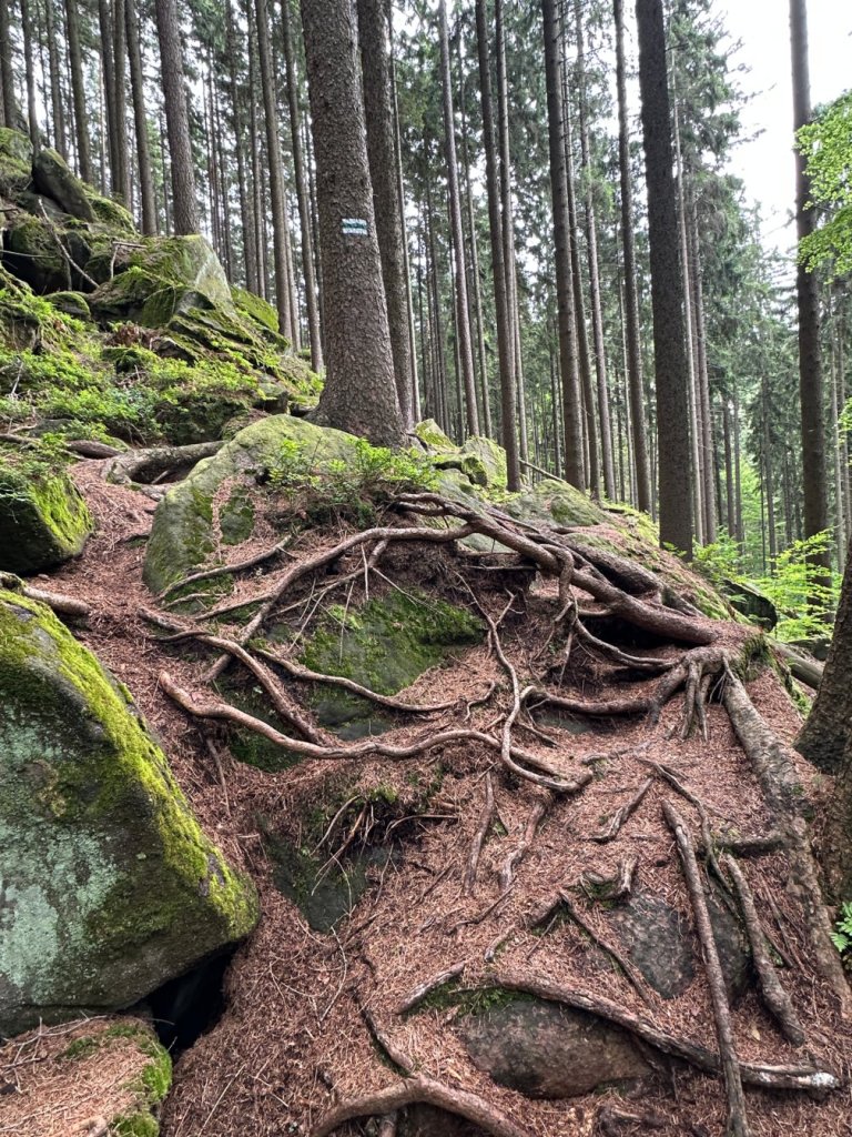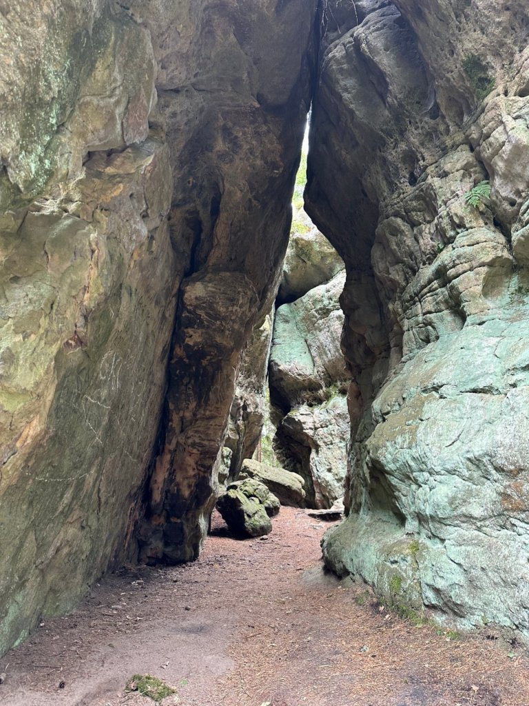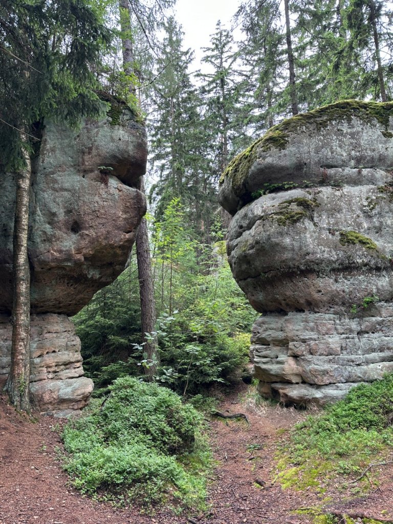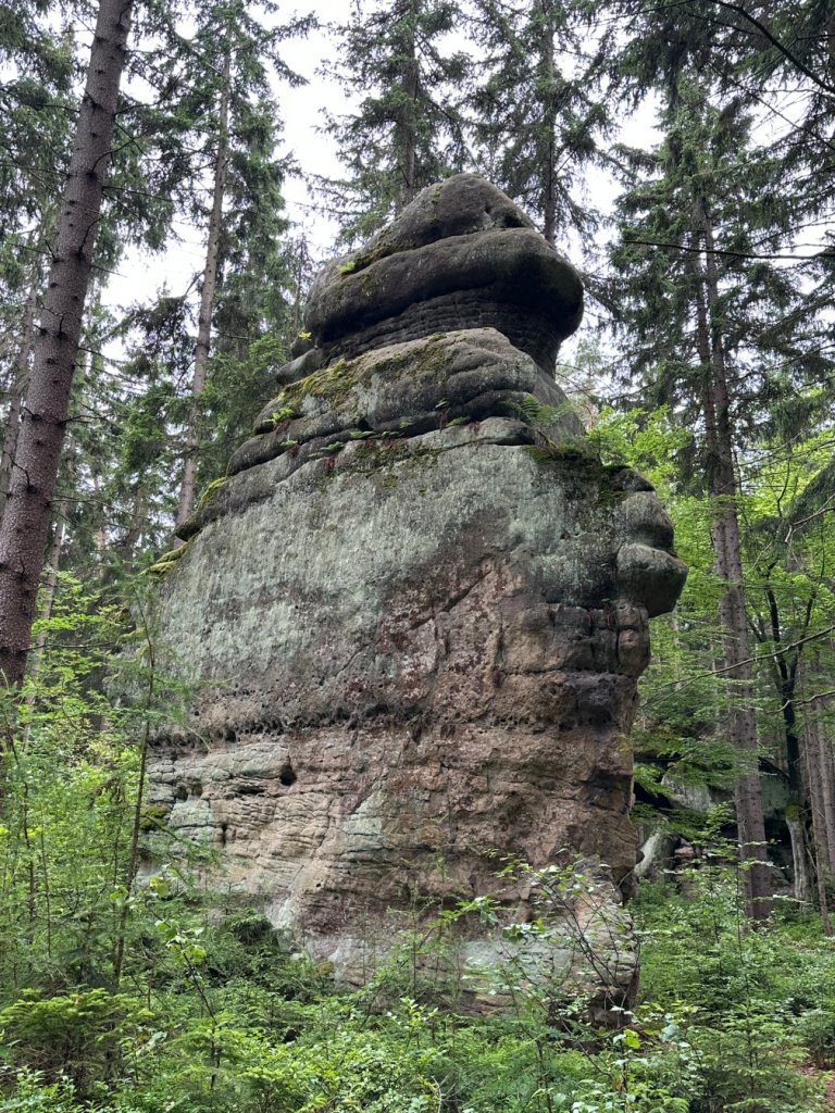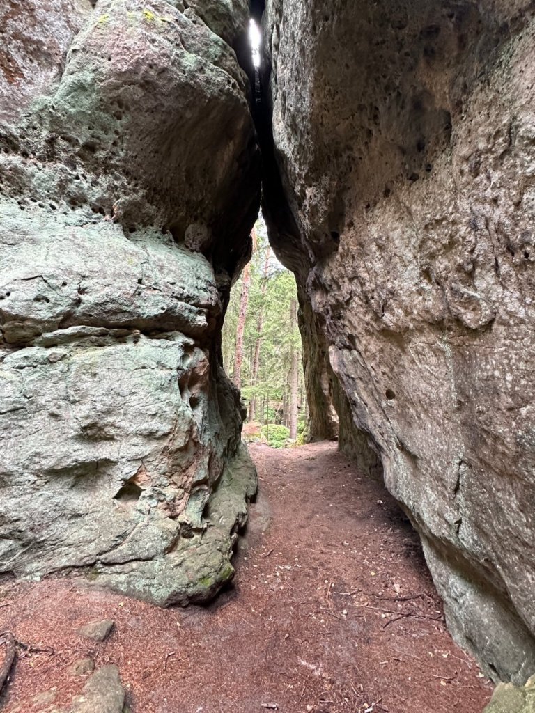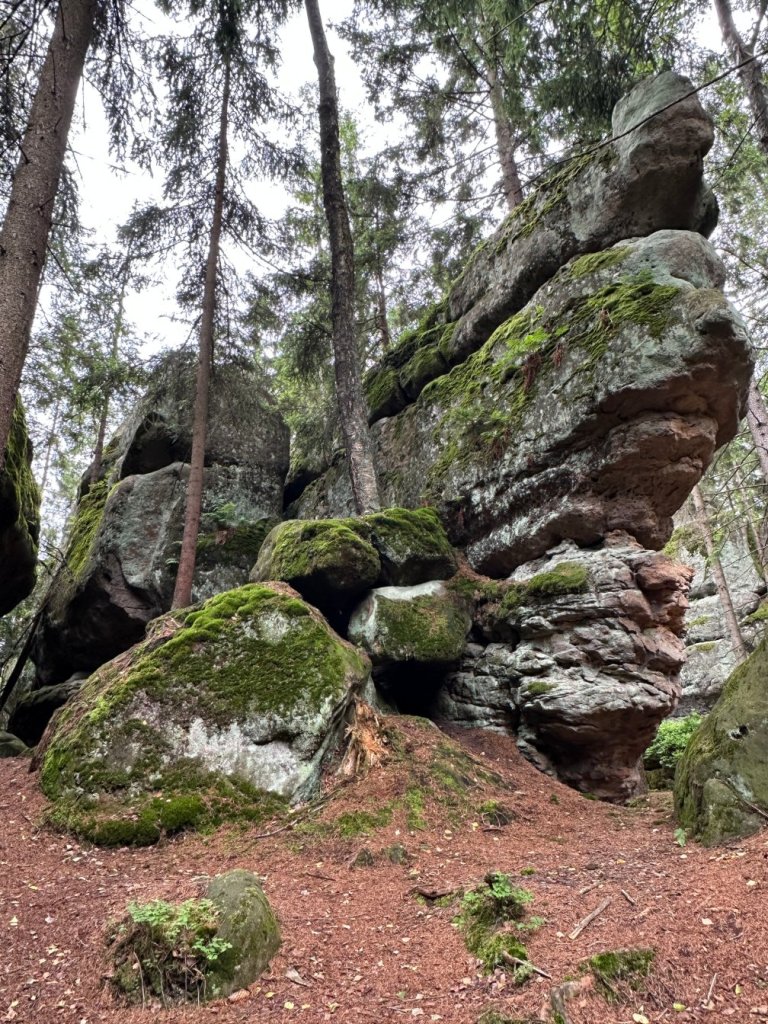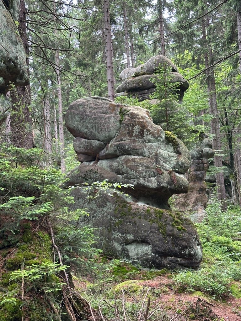 Radkowskie Skały to miejsce, które od dawna nas kusiło – tuż przy słynnej Drodze Stu Zakrętów. Tym razem wybraliśmy pętlę: wejście niebieskim szlakiem, a powrót zielonym. To była trasa pełna formacji skalnych i nieoczywistych wyzwań, gdyż wcześniej padały tu obfite deszcze.