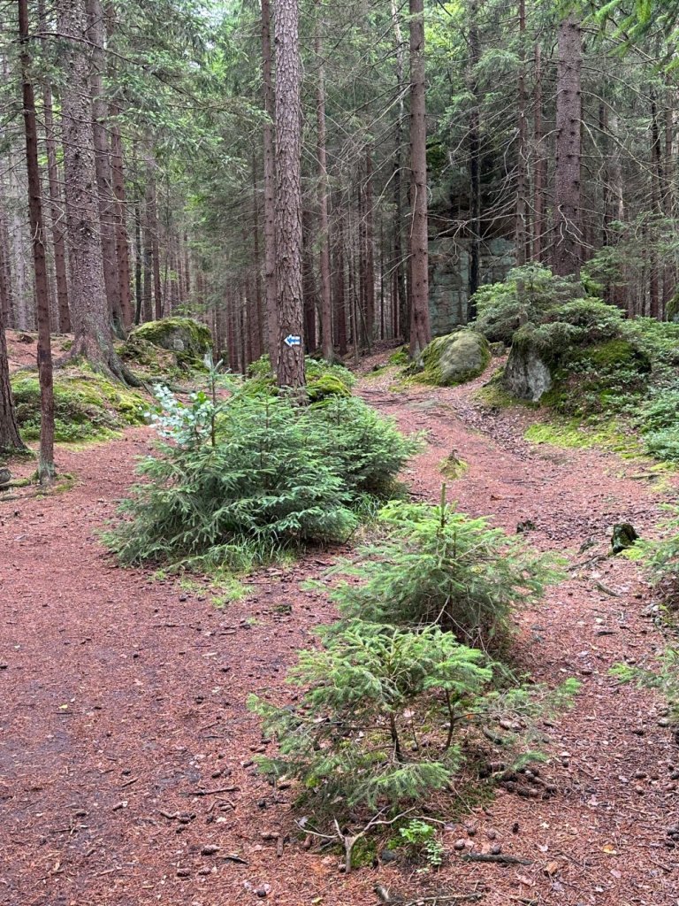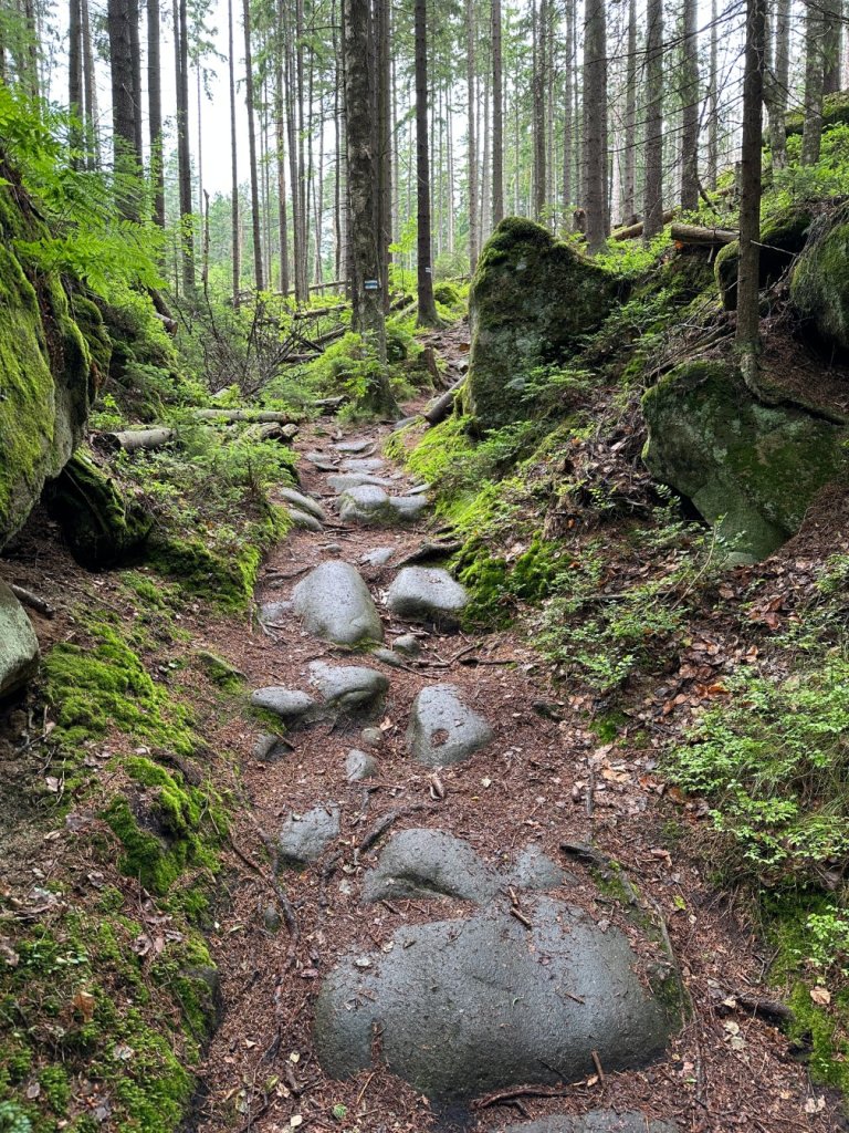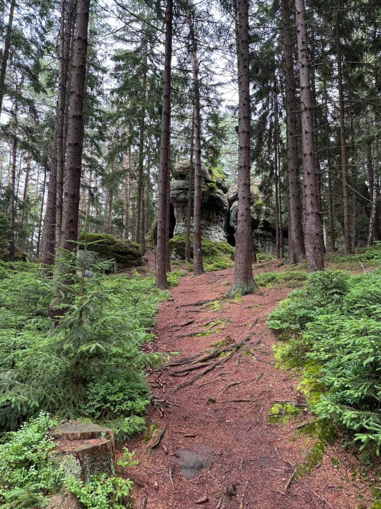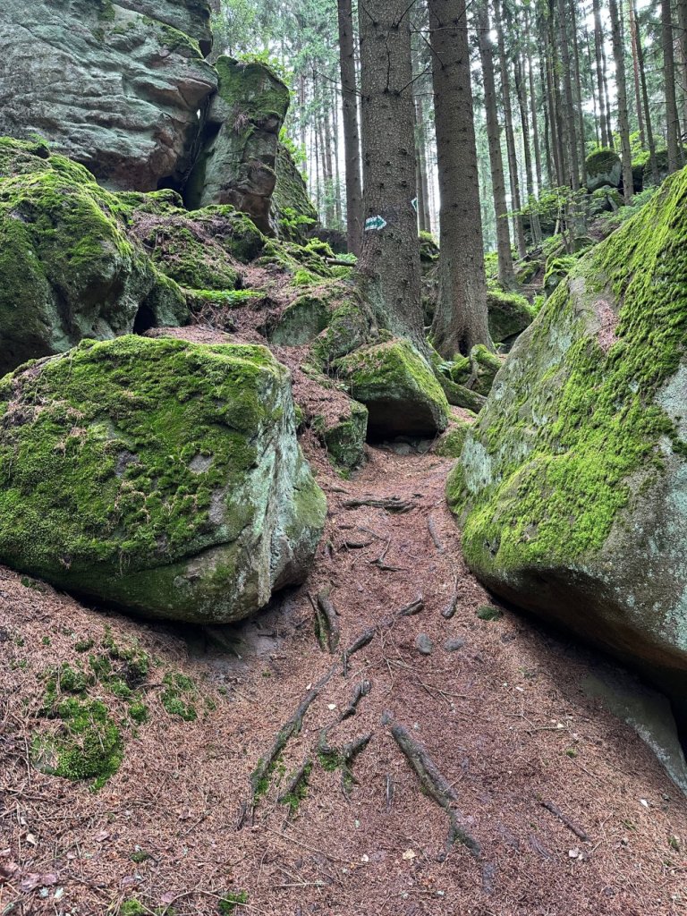 Ścieżka prowadzi wśród drzew i zielonego mchu, a wzdłuż niej wyrastają pierwsze formacje skalne.