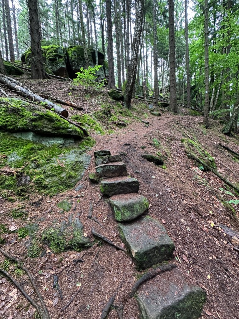 Zielony szlak na Radkowskie Skały to już zupełnie inna historia: trudne podejścia, stromizny wymagające dużej ostrożności, śliskie schody przysypane ściółką, wąskie, zarośnięte fragmenty.