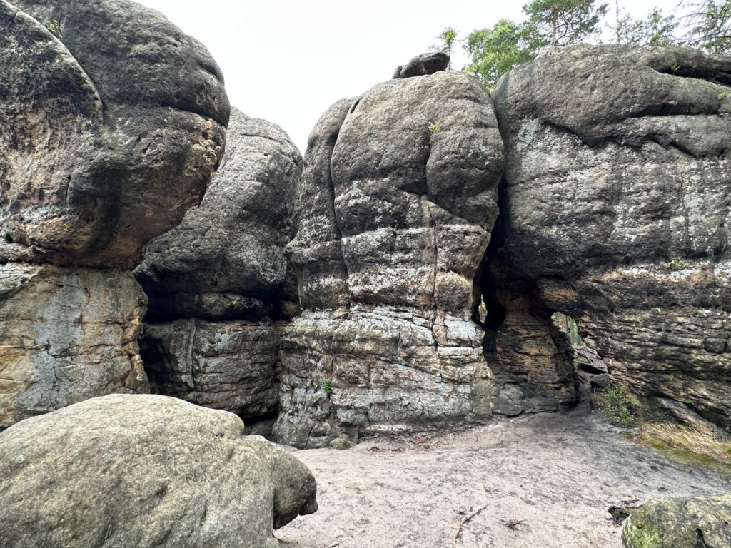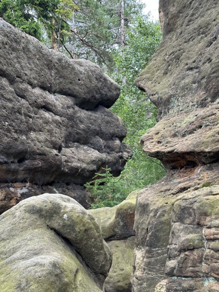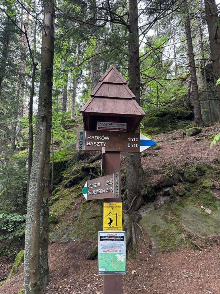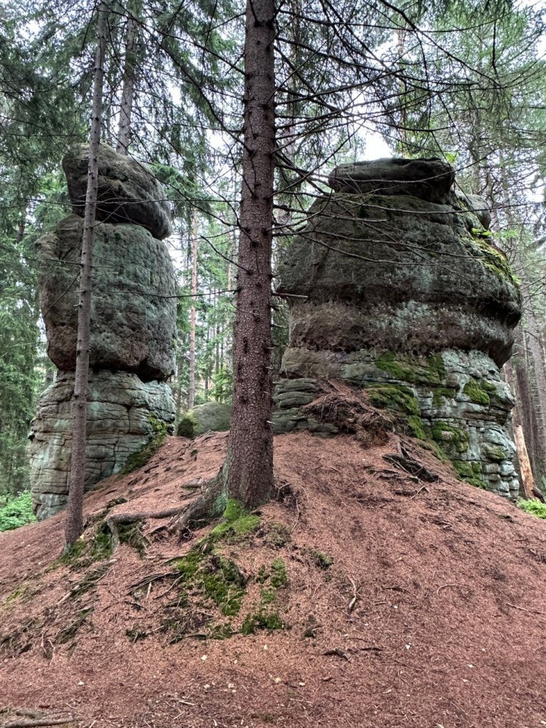 Radkowskie Skały to miejsce, które od dawna nas kusiło – tuż przy słynnej Drodze Stu Zakrętów. Tym razem wybraliśmy pętlę: wejście niebieskim szlakiem, a powrót zielonym. To była trasa pełna formacji skalnych i nieoczywistych wyzwań, gdyż wcześniej padały tu obfite deszcze.