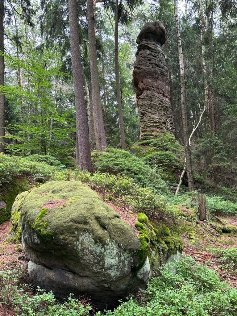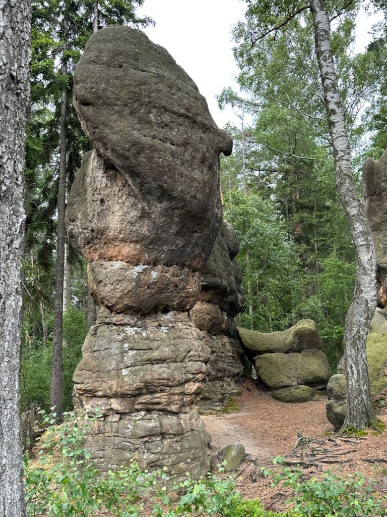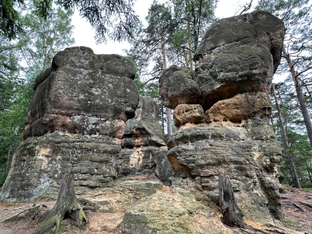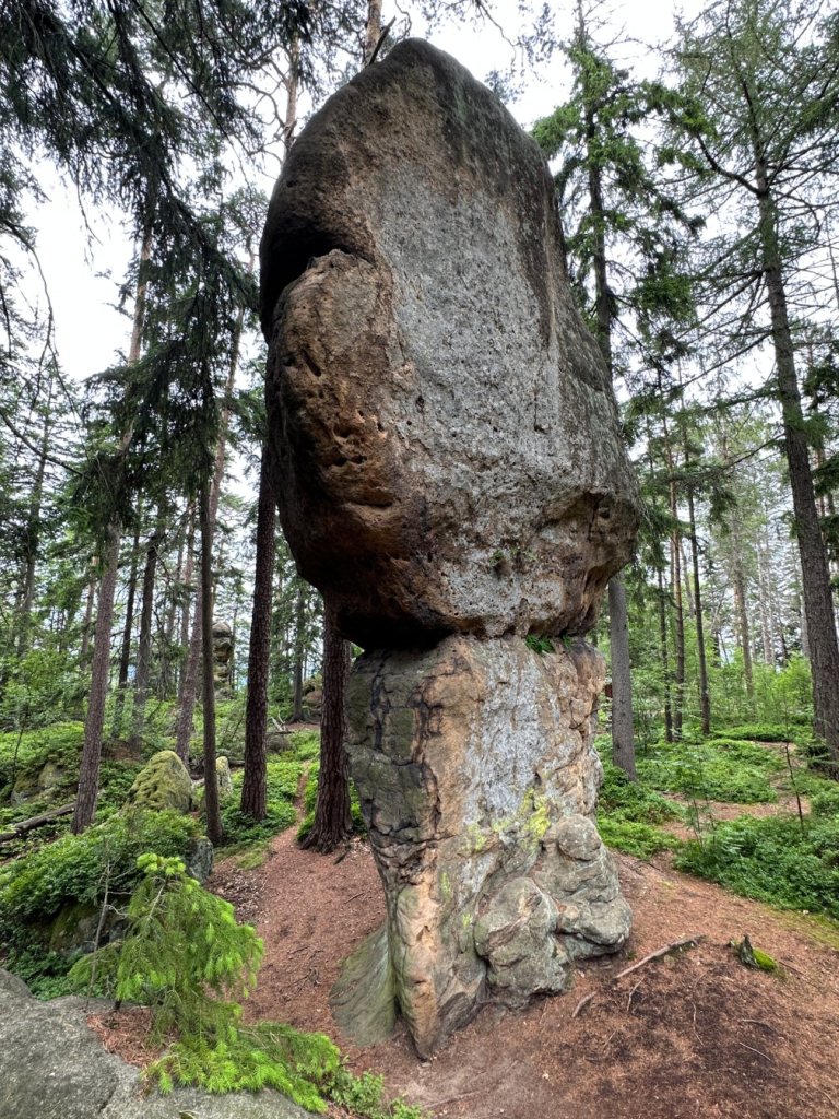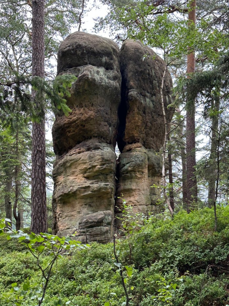 Radkowskie Skały to miejsce, które od dawna nas kusiło – tuż przy słynnej Drodze Stu Zakrętów. Tym razem wybraliśmy pętlę: wejście niebieskim szlakiem, a powrót zielonym. To była trasa pełna formacji skalnych i nieoczywistych wyzwań, gdyż wcześniej padały tu obfite deszcze.