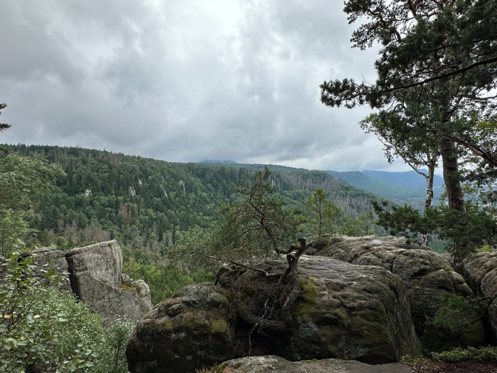 Dotarliśmy do wychodni skalnej gdzie zobaczyliśmy uroczy widok na dolinę pomimo pochmurnej pogody.