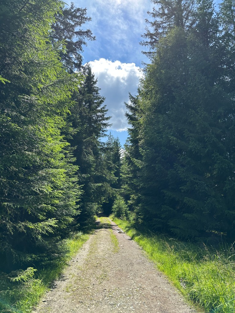 Spacer zamienił się w przyjemny marsz wśród pięknych widoków: niebieskie niebo nad głową, soczysta zieleń lasu wokół, a po drodze znów cisza i spokój.