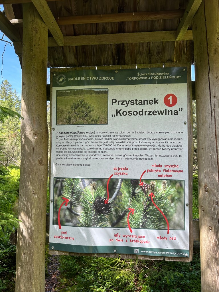 Na trasie mijamy także tabliczki edukacyjne, które opowiadają o torfowisku i jego wyjątkowej roślinności.