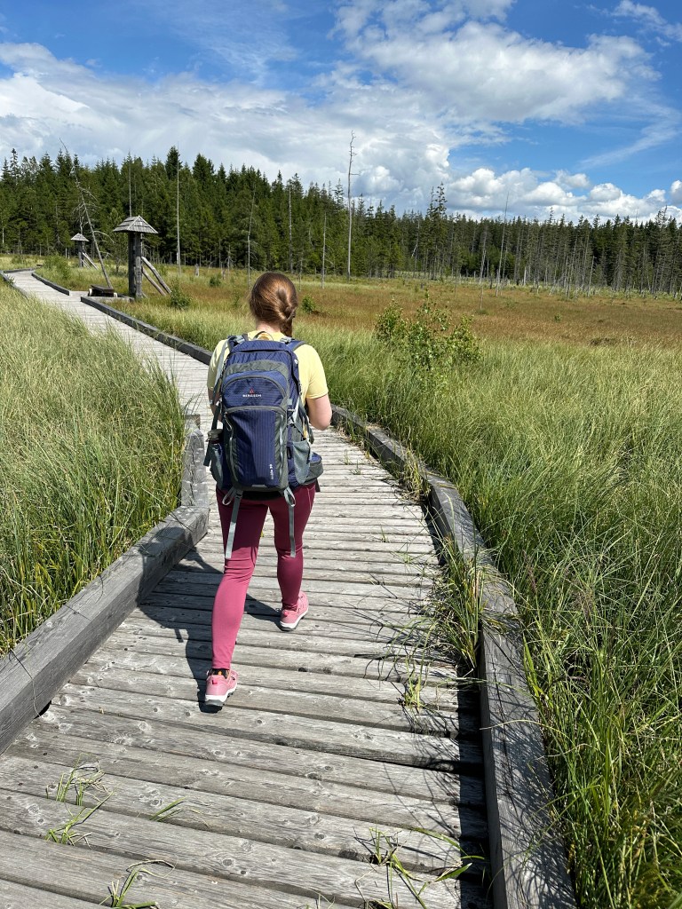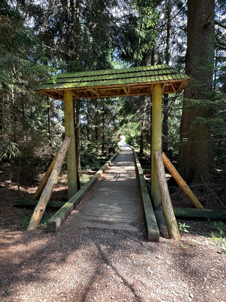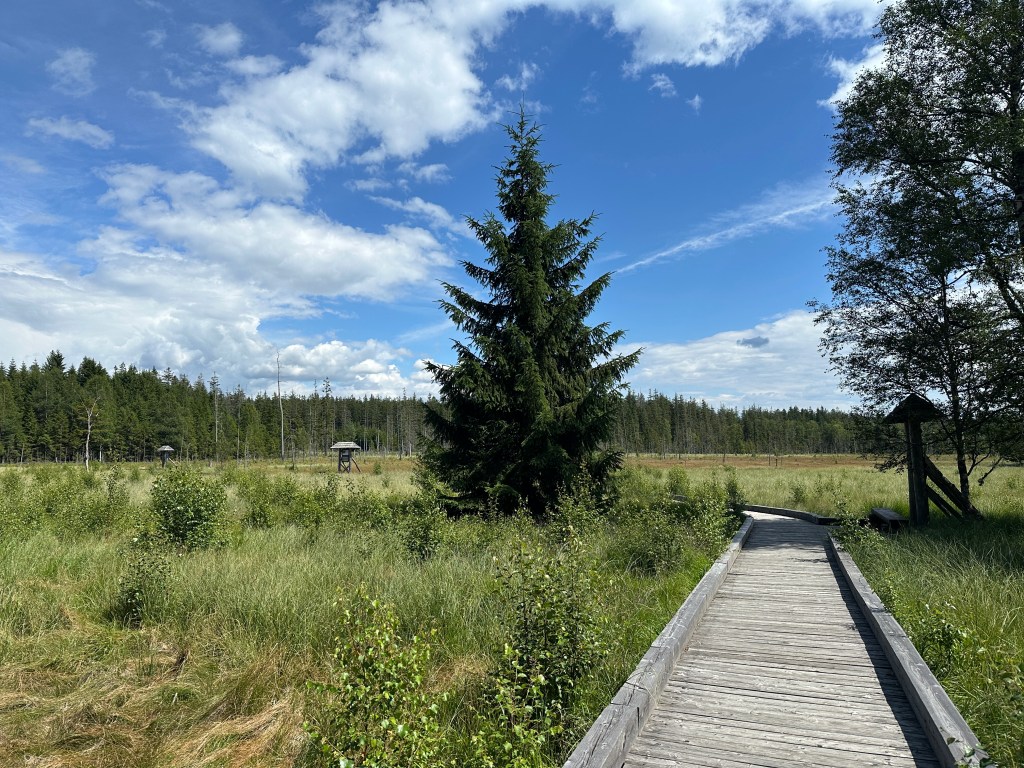 • Krótki dystans, ale pełen różnorodności: strome podejście, cień lasu, drewniana kładka i otwarte przestrzenie torfowiska.