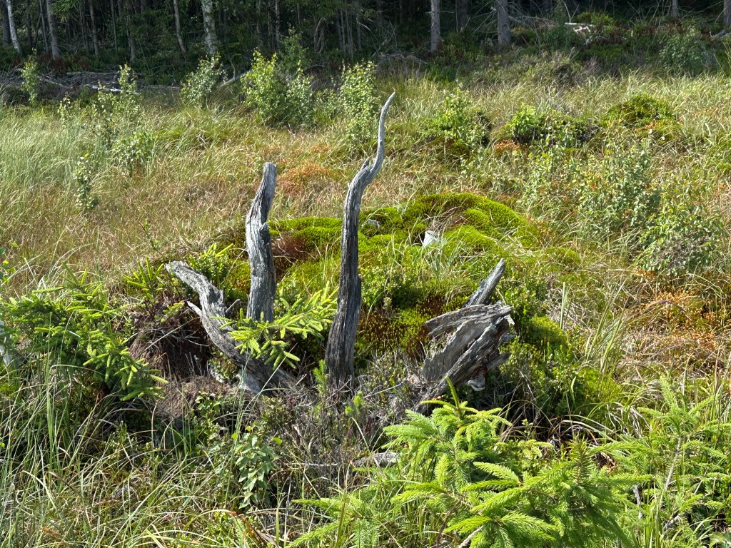Słychać było cykanie owadów, słońce świeciło, a wokół dominowały charakterystyczne krajobrazy: martwe, szare drzewa kontrastujące z żywymi, zielonymi brzózkami i niskimi drzewkami, które powoli zaczynają zarastać torfowisko.