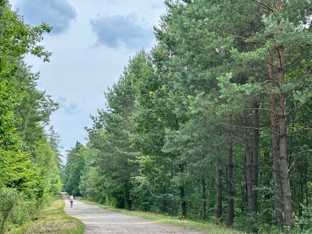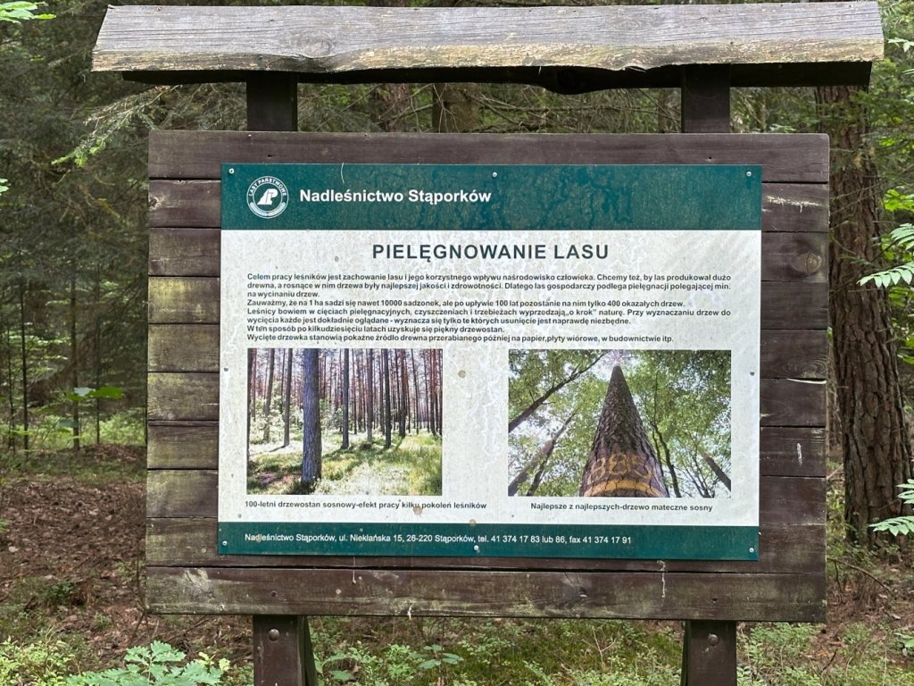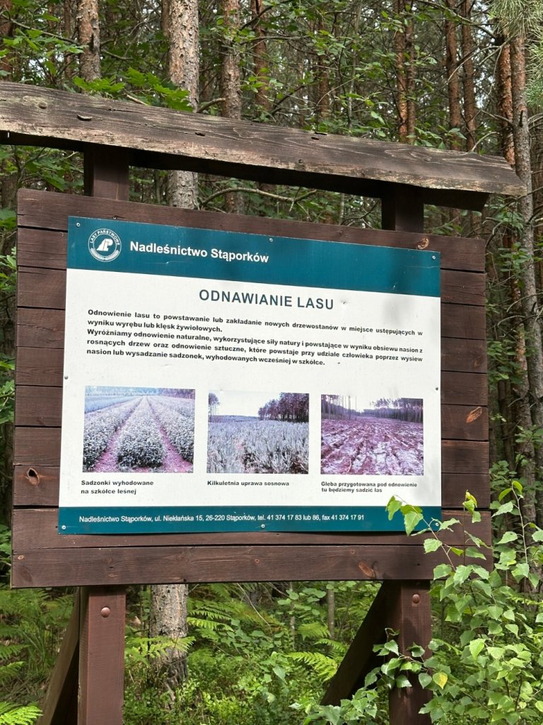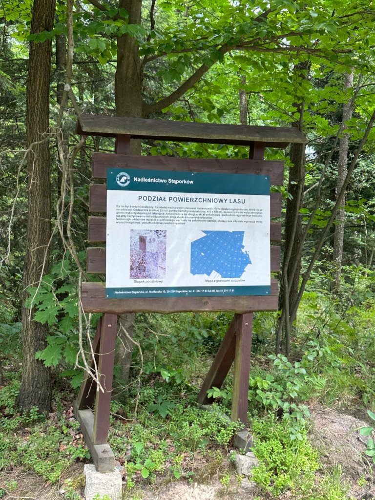 Tutaj dowiadujemy się o podziale na oddziały leśne i funkcji słupków w lesie. Skręcamy w piaszczystą drogę – pachnie nagrzanym piaskiem i sosnami. Szyszki trzaskają nam pod stopami.