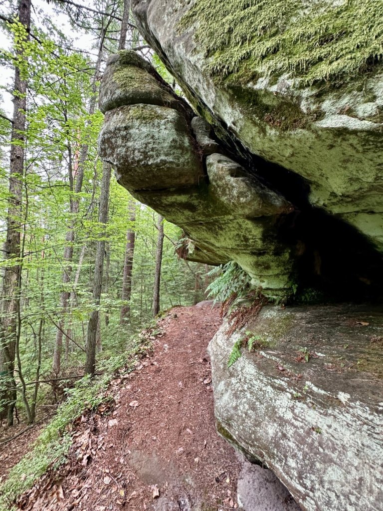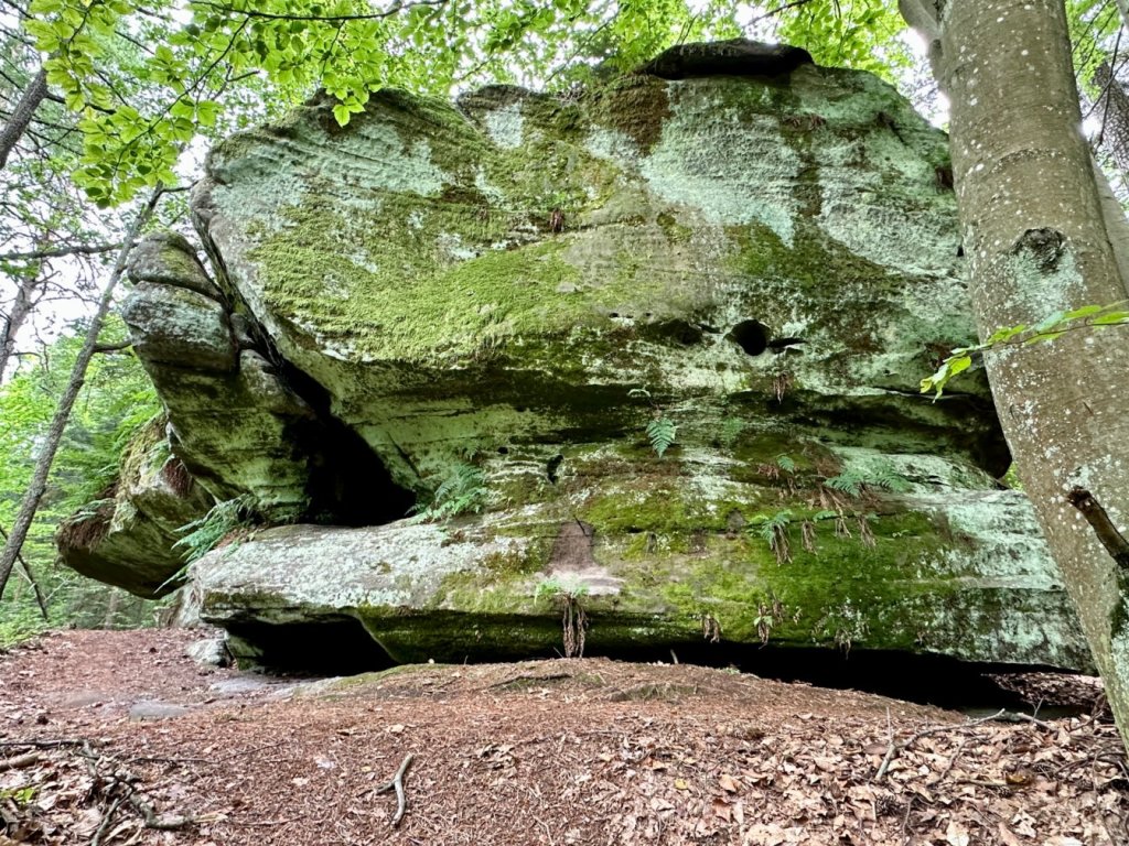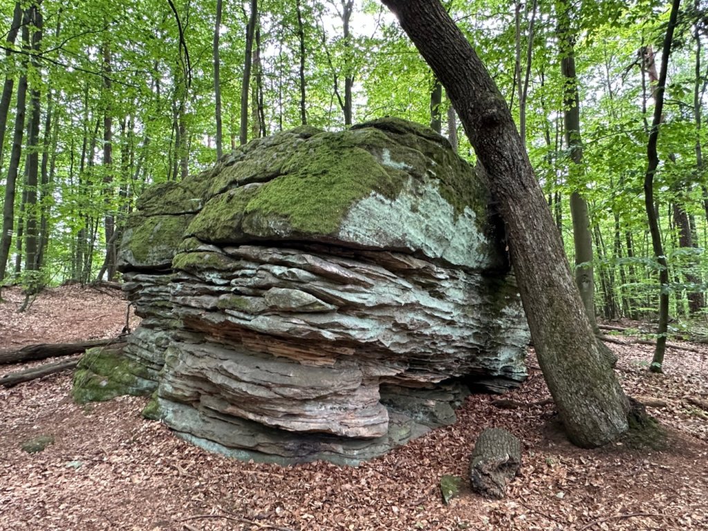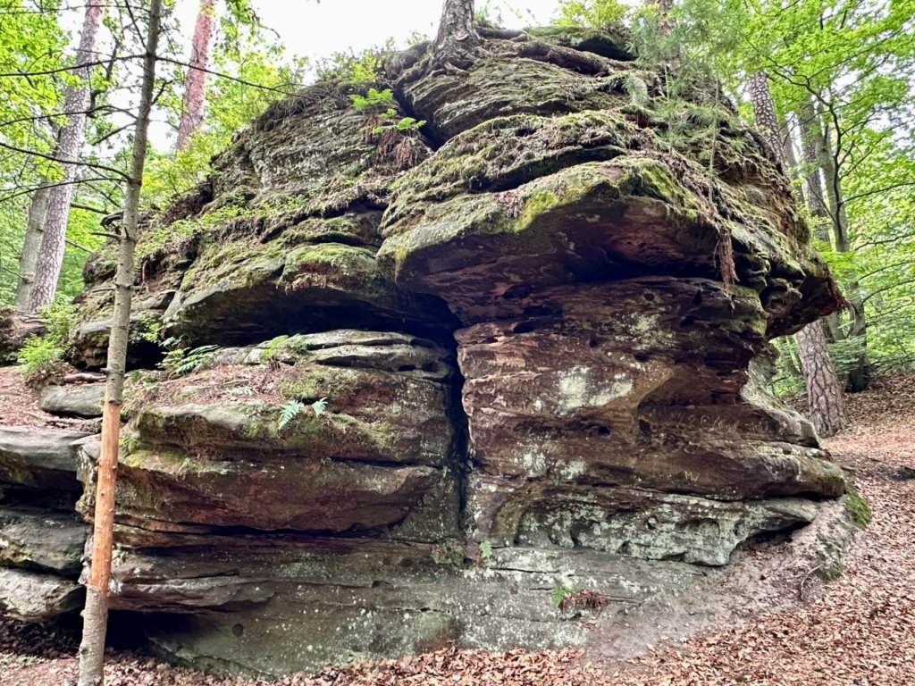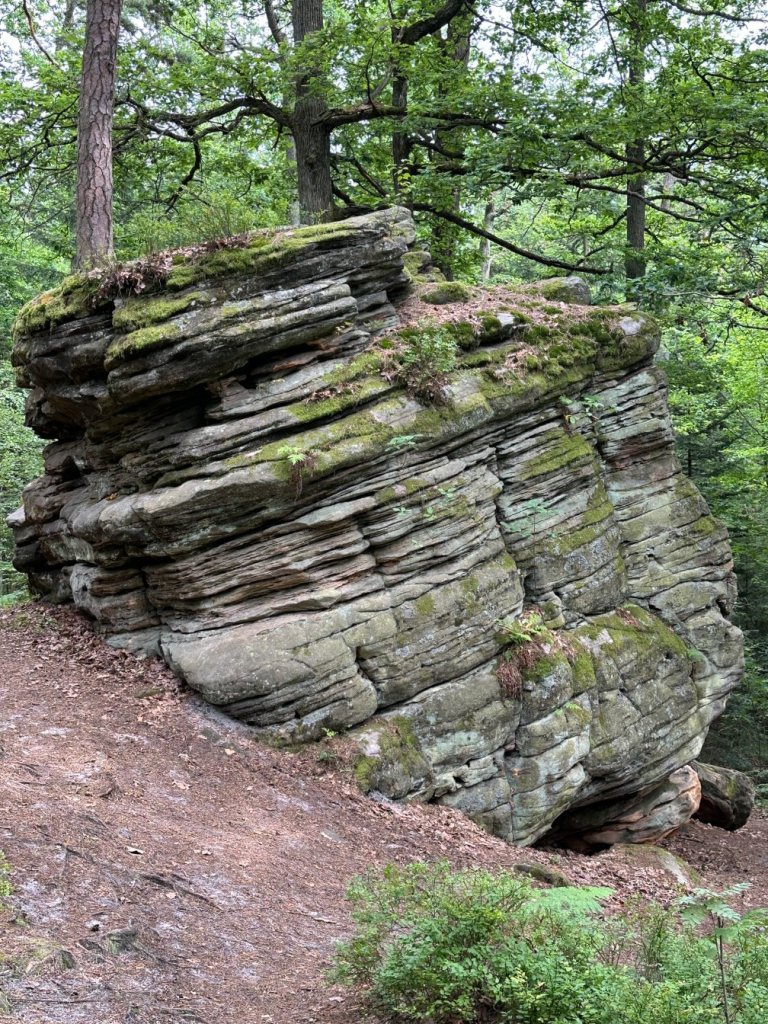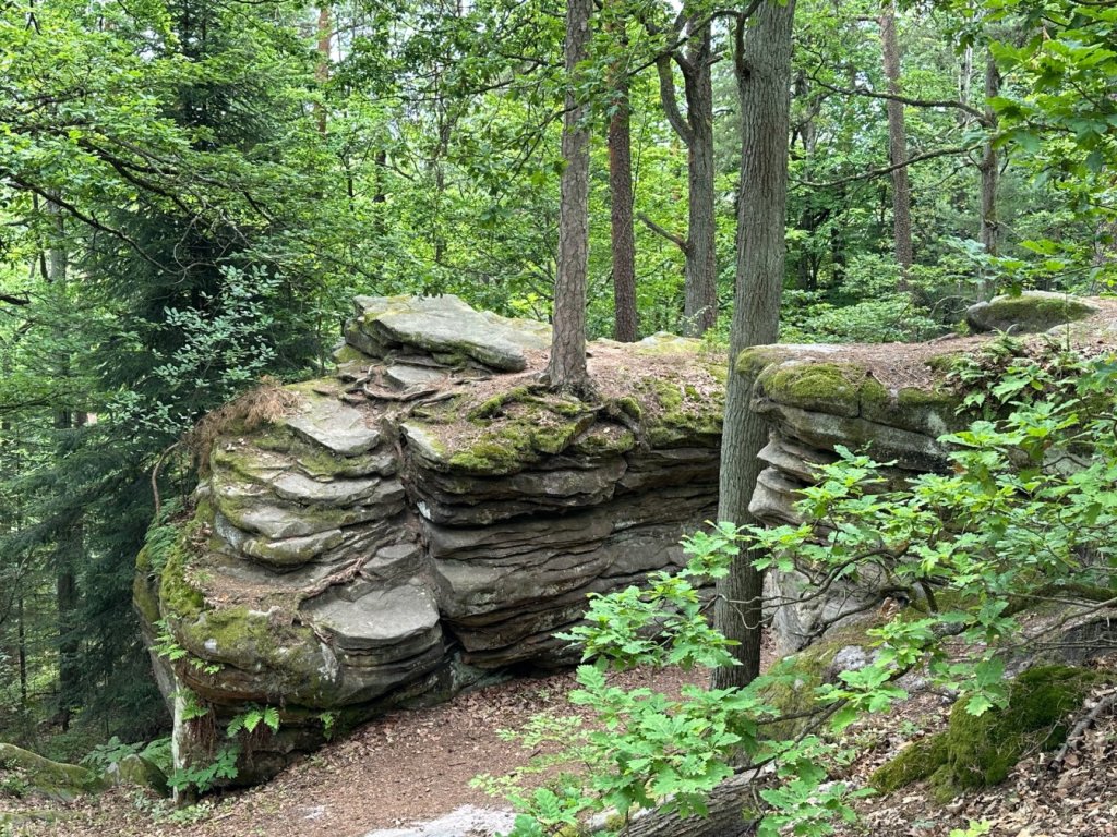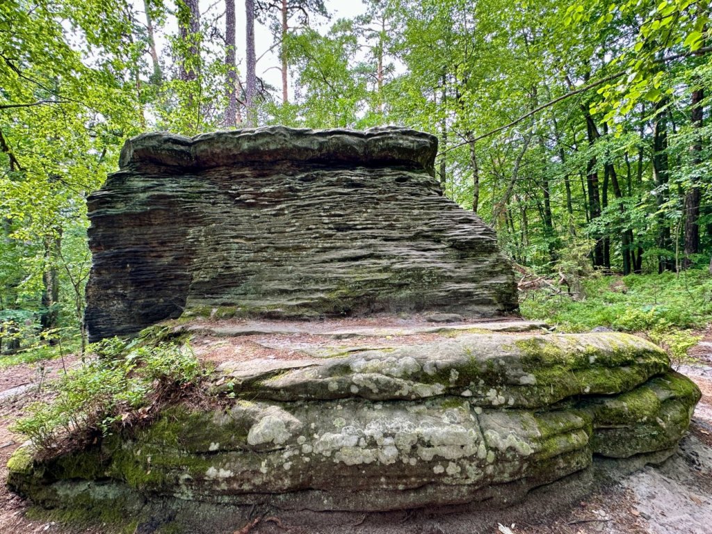 Docieramy do tablicy informacyjnej – dowiadujemy się, że tutejsze skały to wczesnojurajskie piaskowce sprzed 200 mln lat. Odpoczywamy prze stole piknikowym stojącym obok. Znowu podchodzimy pod górę i dostrzegamy kolejne formacje skalne.