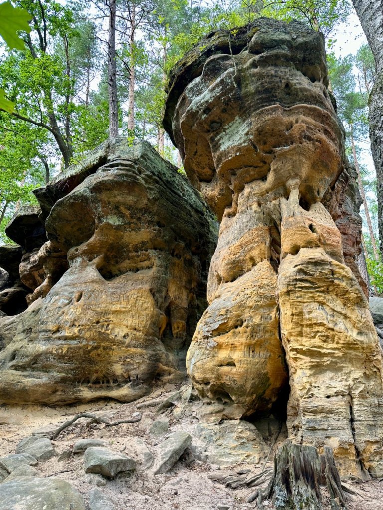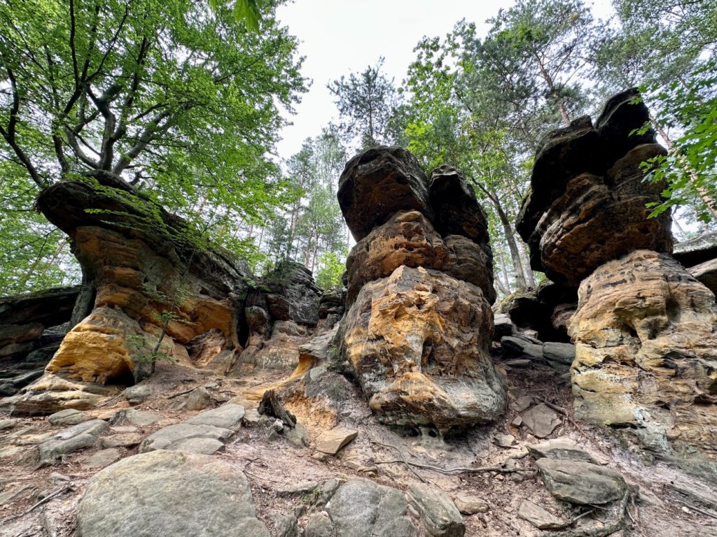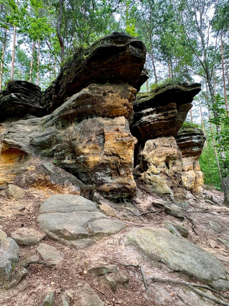 Po wizycie w Piekle Dalejowskim nie mogliśmy się oprzeć pokusie odwiedzenia kolejnego „piekła” – tym razem nad Niekłaniem. To również fragment Piekielnego Szlaku, ale zupełnie inny w charakterze. Bardziej dydaktyczny, uporządkowany, ale też zaskakująco malowniczy. Niektóre skały przypominały nam Skalne Grzyby czy Radkowskie Skały, inne wyglądały jak stoły, ławy albo ściany. Idealne miejsce na popołudniową wędrówkę – nie za długą, ale pełną sensorycznych bodźców i ciekawostek.