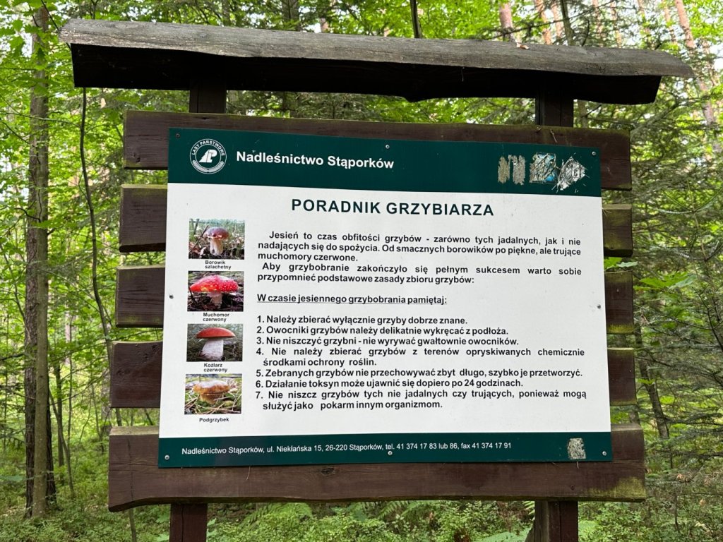 Schodzimy niżej leśną ścieżką. Przystajemy przy tabliczce o grzybach. Nie zbieramy, ale czytamy z zaciekawieniem.
