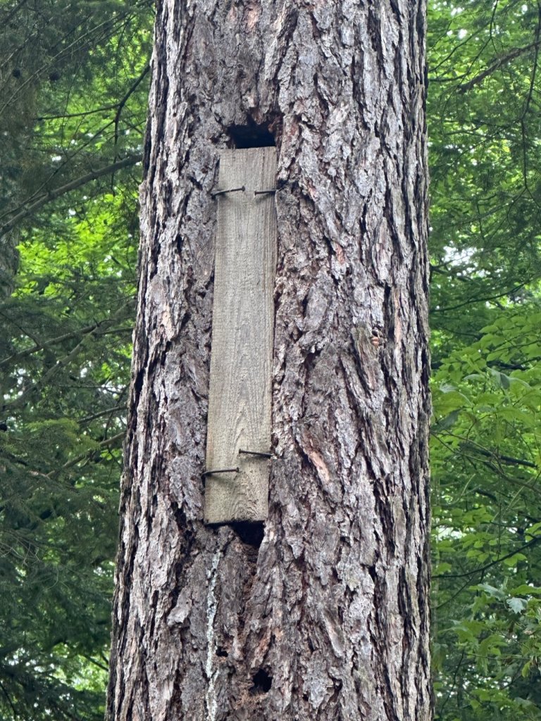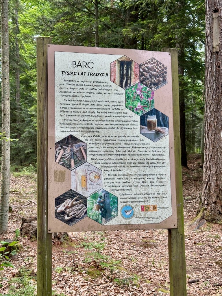 Idziemy prostą leśną ścieżką aż docieramy do tabliczki, z której dowiadujemy się, że miód z barci zbiera się raz w roku jesienią. Oglądamy barć na drzewie – niecodzienny widok.