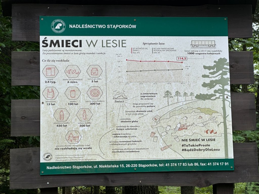 Tutaj spotyka nas informacja z dziedziny ekologii, jak długo rozkładają się odpady – od 6 miesięcy (skórka pomarańczy) do 500 lat (szklana butelka). Obok stoi zarośnięty stół piknikowy, którego w początkowo nie zauważamy. Widzimy na drzewie oznaczenie szlaku, ale sam szlak jest ledwo widoczny. Wracamy na szutrową drogę.