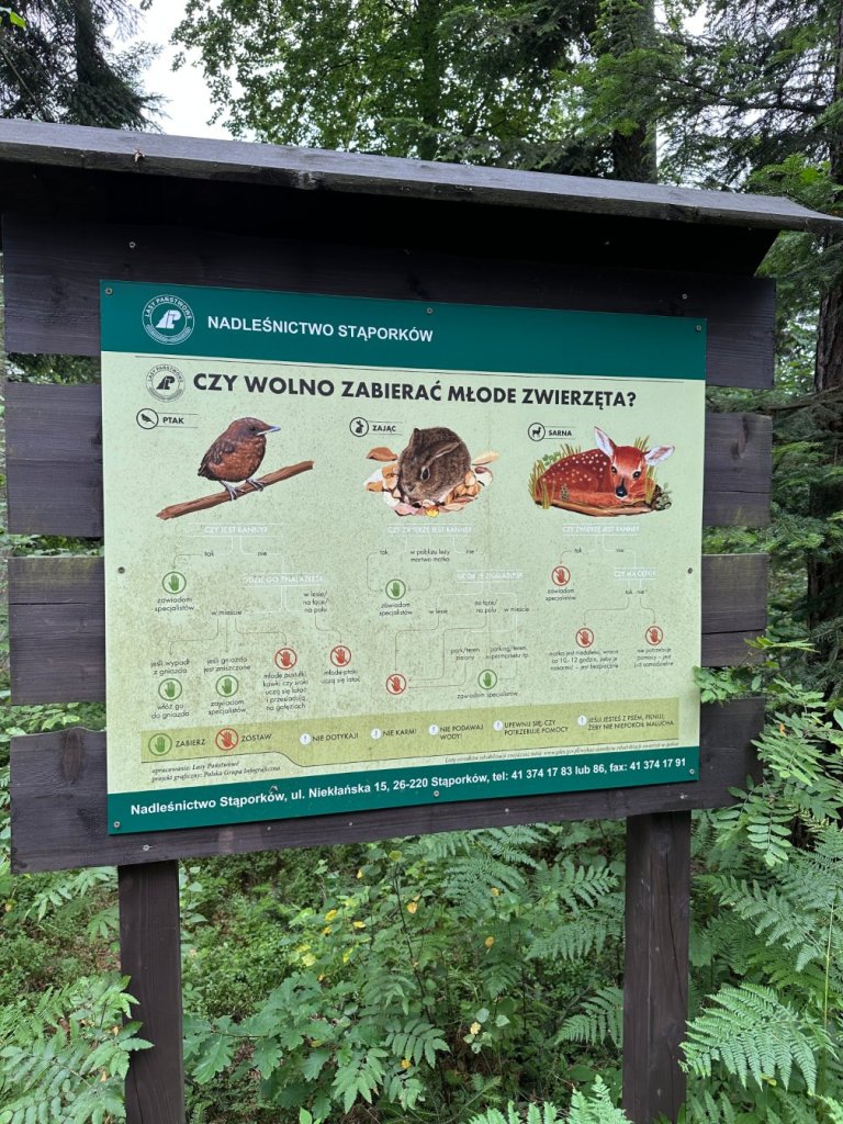 Uczymy się, co robić, jeśli spotkamy młode zwierzę w lesie. Mijają nas rowerzyści i kolejni turyści szukający leśnych wrażeń.