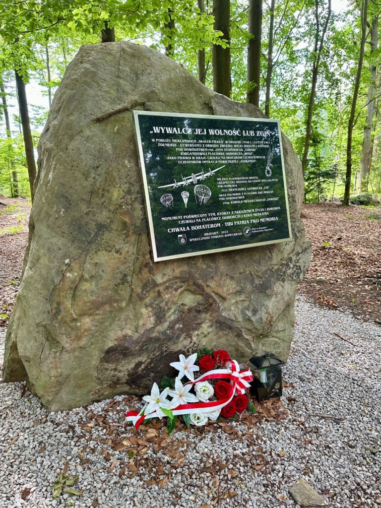 Rozpoczynamy przy parkingu, szeroką leśną drogą. Tabliczki, ławki i źródełko przyciągają turystów – niestety, dość tłoczno i ciągle zajęte. Pachnie lasem, wokół wysokie drzewa. Mijamy skalny pomnik upamiętniający oddziały oczekujące na zrzuty dywersantów w 1940 i 1941 roku – wzruszający i trochę ukryty w cieniu.