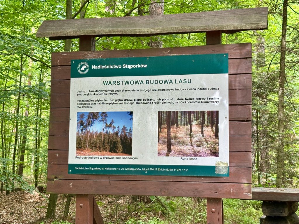 Zatrzymujemy się przy tablicy edukacyjnej opisującej piętra lasu. Obok stoi stół piknikowy, idealny na odpoczynek, jeszcze go nie potrzebujemy. W głąb lasu dalej prowadzi nas szeroka i szutrowa droga.