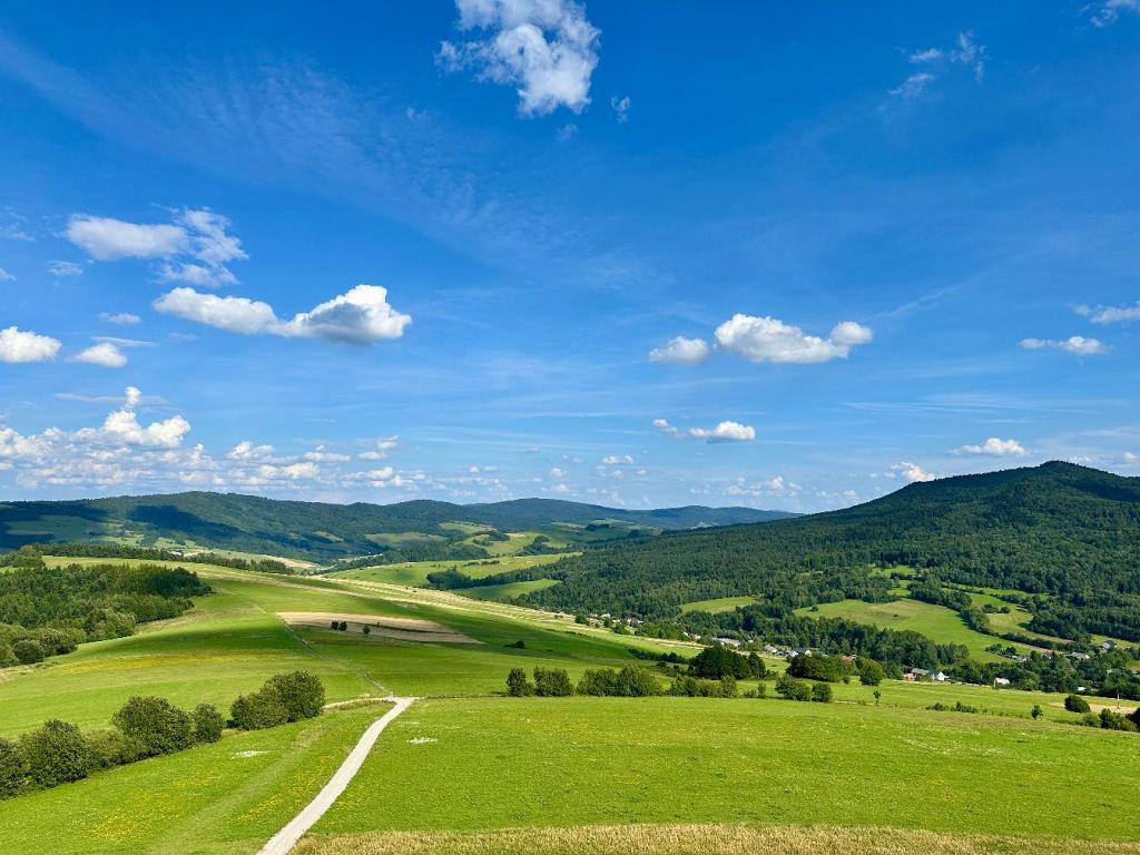 Ze szczytu rozpościera się panorama – błękitne niebo z białymi chmurami, zielone łąki, pasma lasów oraz ciemniejsze, deszczowe chmury w oddali.