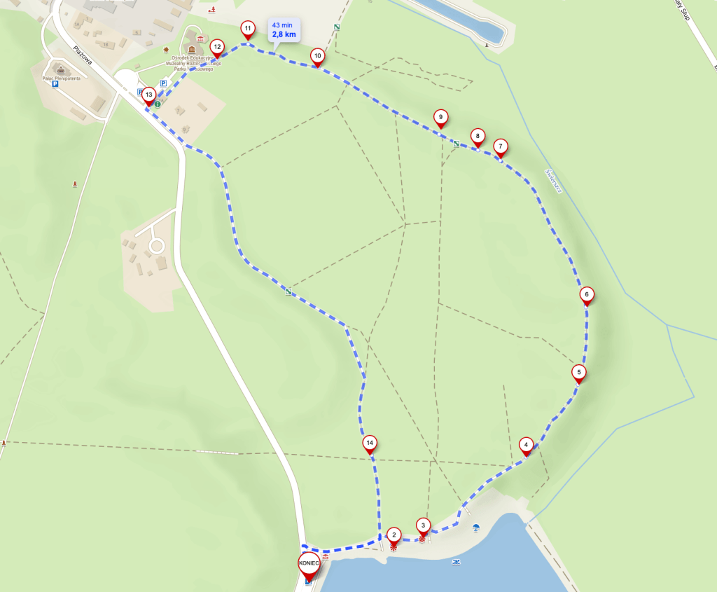 TRASA: Parking – Kierujemy się cały czas kładką nad brzegiem stawu – Na końcu kładki idziemy dalej prosto kierując się oznaczeniami szlaku niebieskiego tak aby mieć cały czas drewniane ogrodzenie po prawej stronie – Na skrzyżowaniu prosto – Za około 100m jest kolejne skrzyżowanie na którym również idziemy prosto – Dochodzimy do furtki na tyłach muzeum RPN i przechodzimy przez nią – Po dojściu do chodnika skręcamy w lewo – Ścieżka przechodzi w las a my kierujemy się cały czas oznaczeniami trasy aż dojdziemy do kładki nad stawami Echo – Skręcamy w prawo – Parking