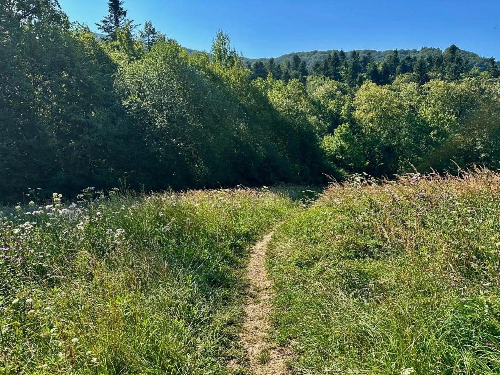 Wyruszamy z niewielkiego parkingu tuż za wioską. Tuż obok wita nas figura Matki Boskiej. Schodzimy w dół przez łąkę – wysokie trawy i rośliny muskają nam nogi, a słońce grzeje bez litości.