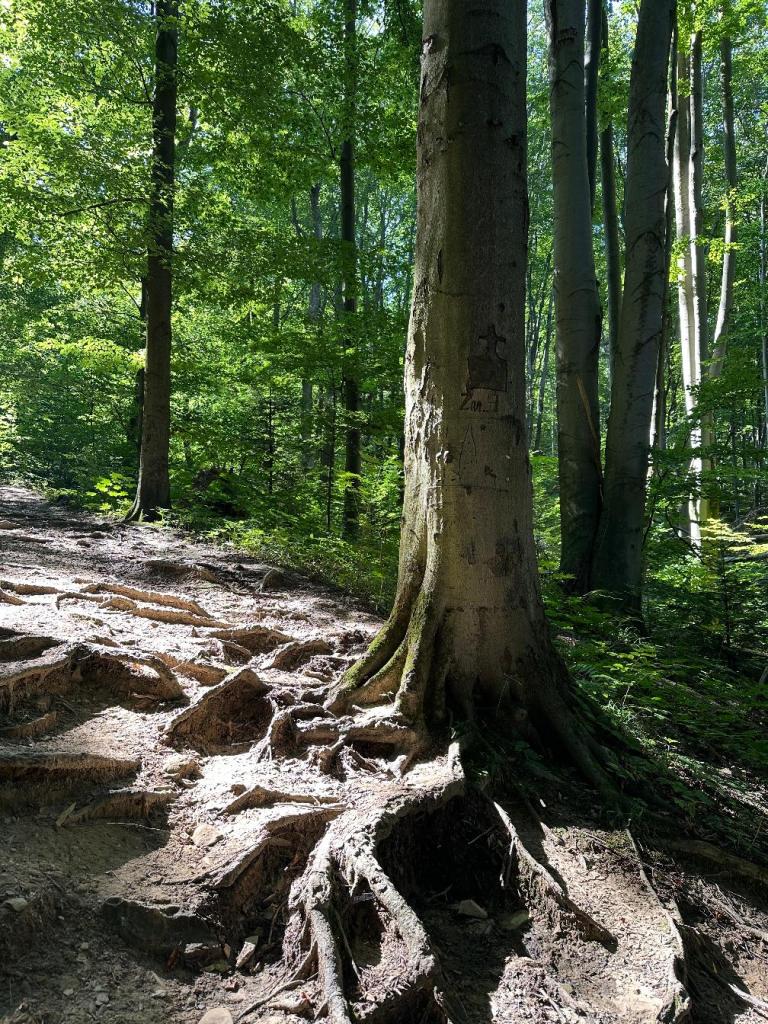 Podejście łagodnieje, a w lesie robi się jaśniej. Pod nogami mijamy warstwowe, płaskie kamienie ułożone pod skosem – wyglądają jak naturalne schody czasu.